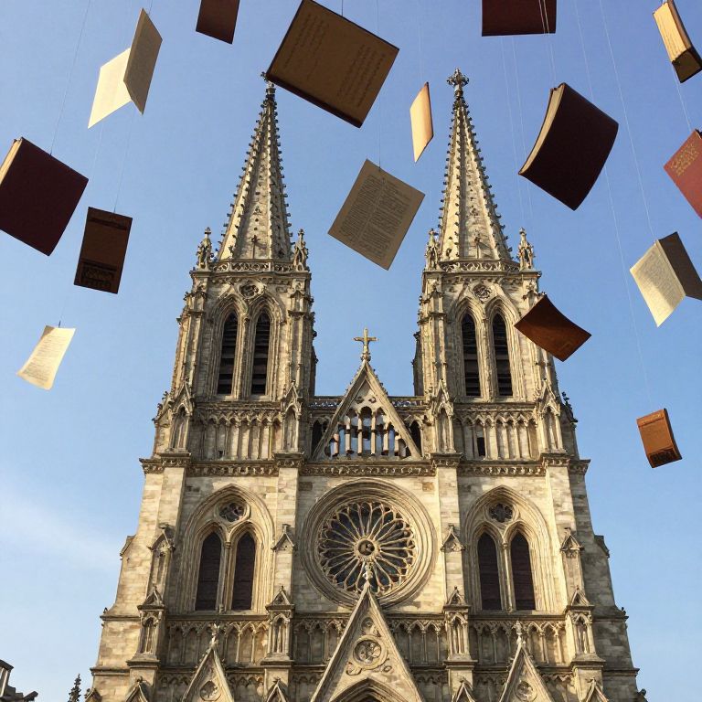 Photograph of a Gothic-style cathedral with two tall, ornate spires adorned with intricate stone carvings and a large circular rose window between them. The cathedral's facade is illuminated by sunlight, highlighting its detailed stonework. In the foreground, numerous wooden square panels float in the bright blue sky, suspended by invisible strings. The panels are randomly arranged and cast subtle shadows on the cathedral. The overall scene combines the historic architecture of the cathedral with the modern, whimsical element of the floating panels, creating a striking contrast.