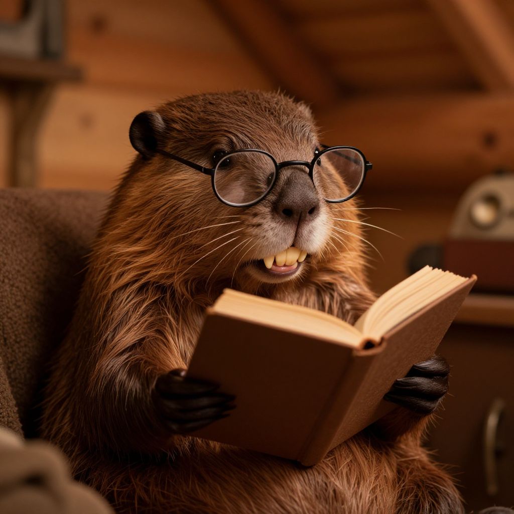 Photograph of a brown beaver with black-rimmed glasses, reading a book in a cozy wooden cabin, with warm, dim lighting.