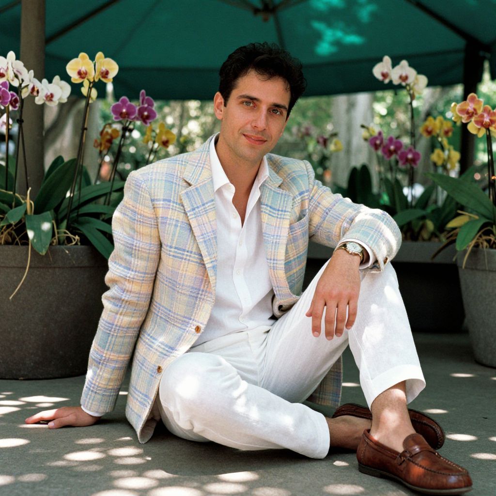 A man, preppy madras jacket in pastel colors, crisp white cotton shirt, tailored white linen pants, brown leather driving loafers, lush green canopy, vibrant orchids, dappled sunlight filtering through, anscochrome analog film, relaxed smile, enjoying the moment.Man has masculine face and piercing eyes