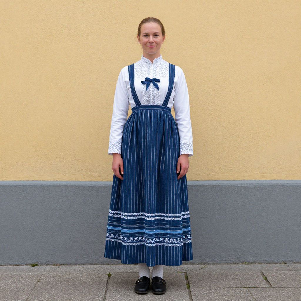 "Traditional Danish Dress, woman in a traditional dress standing in front of a wall"