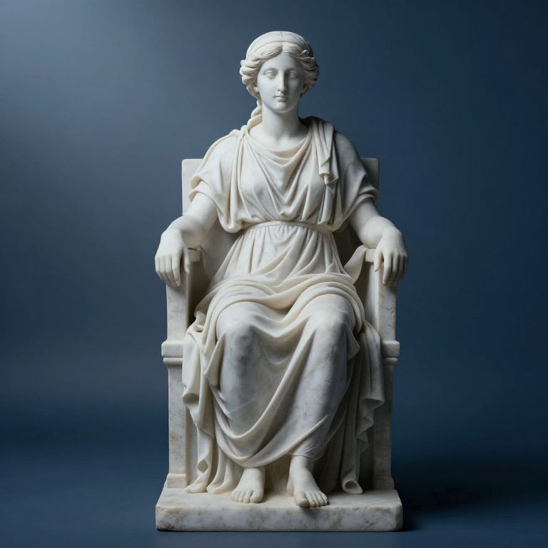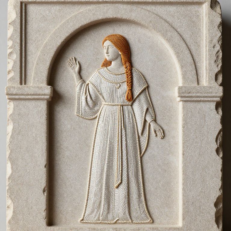 "Embroidery Transfer a stone relief of a tall hardy priestess standing in an arched lintel with her hair in one thick braid over one shoulder,"