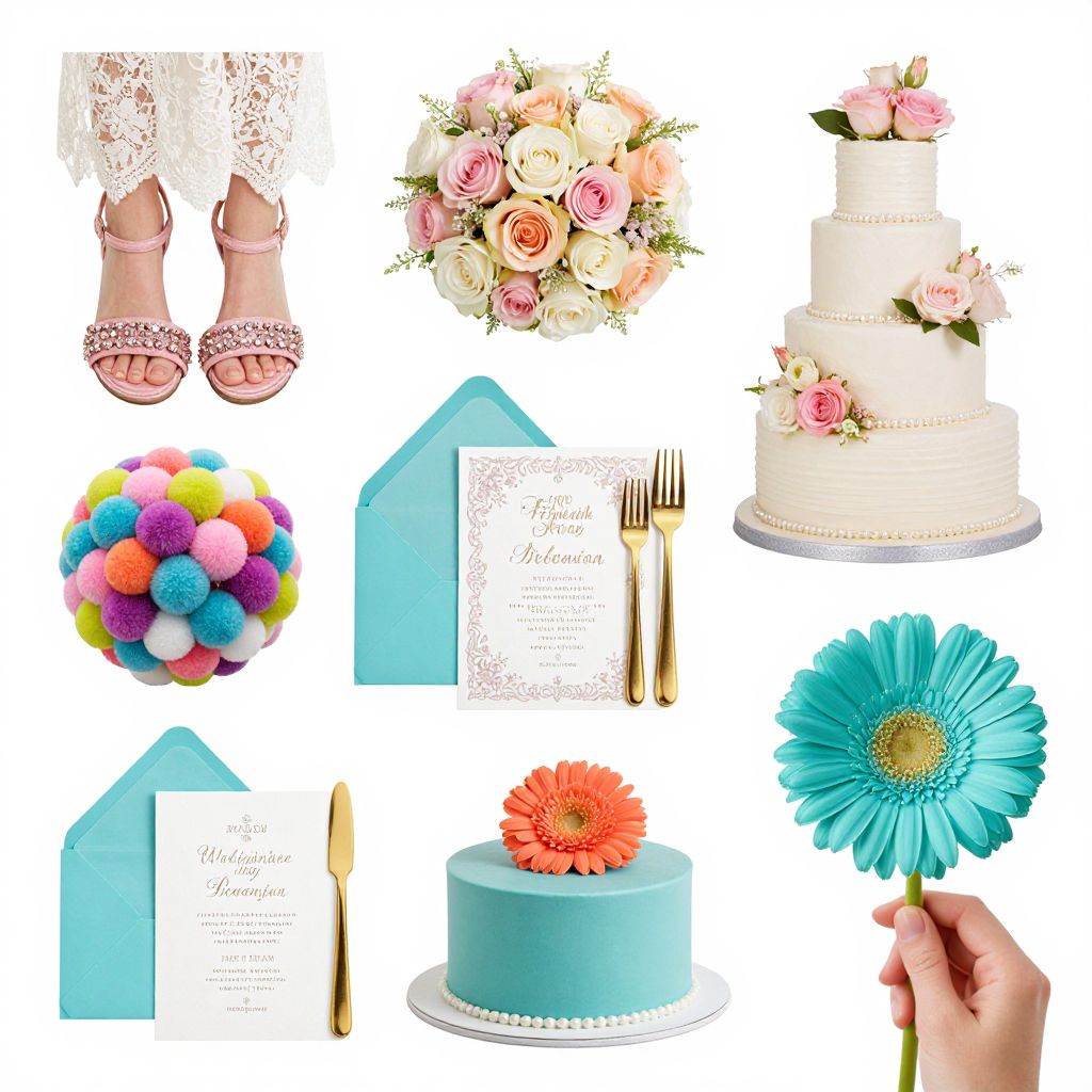 Tiffany Blue and Pink Wedding Inspiration Board showcases nine distinct elements, including a woman wearing a lace dress, pink embellished sandals, a tiered wedding cake decorated with pastel roses, a bouquet of soft-colored roses, a spherical arrangement of colorful pom-poms, a detailed invitation card with gold cutlery, a turquoise cake topped with a coral flower, and a hand holding a vibrant turquoise gerbera daisy, all harmoniously blending romantic and elegant themes.