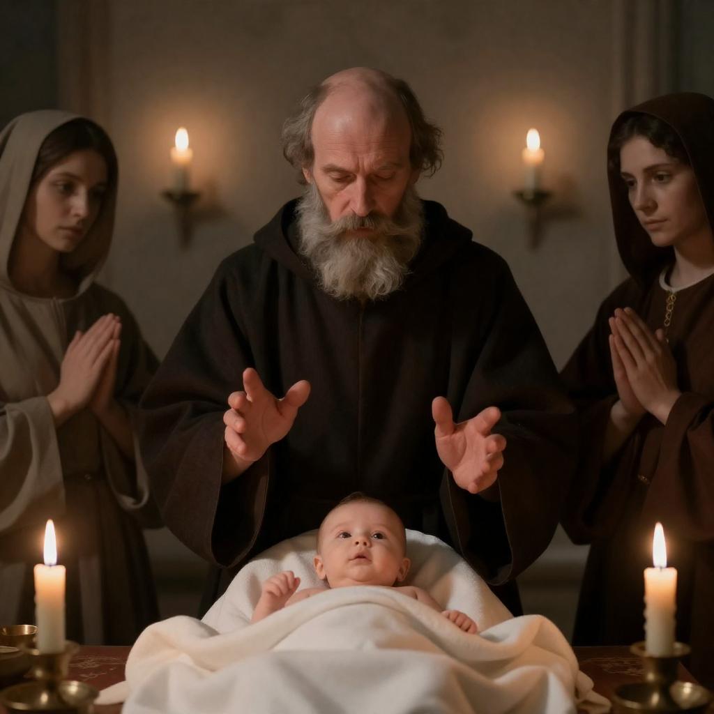 Medieval scene with three men in beige robes attending a wounded man lying on a wooden table. Wounded man in white cloth, arms and legs exposed. Ornate chandeliers, dark room with tapestries. Bald man on right points, two men on left observe.