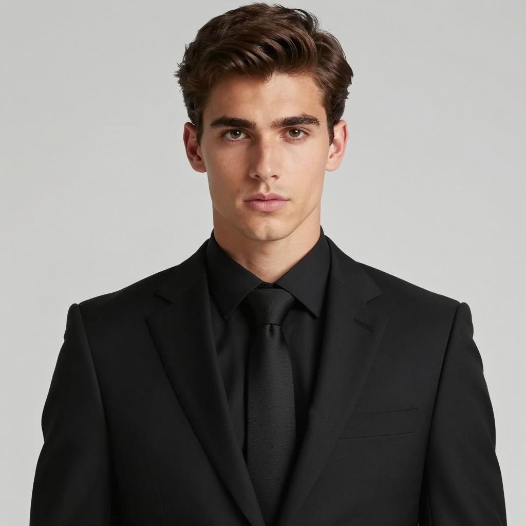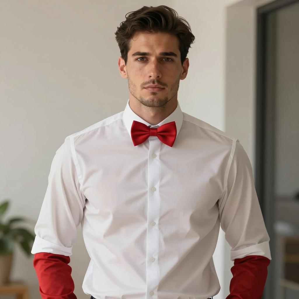Male shoulders fancy dress, photograph of a handsome young man, fair skin, light brown hair, styled neatly, wearing a red vest with black suspenders, white ruffled shirt, red bow tie, white pom-pom buttons, dark background, studio lighting, realistic, portrait, upper body, serious expression, detailed ures, slight shadows