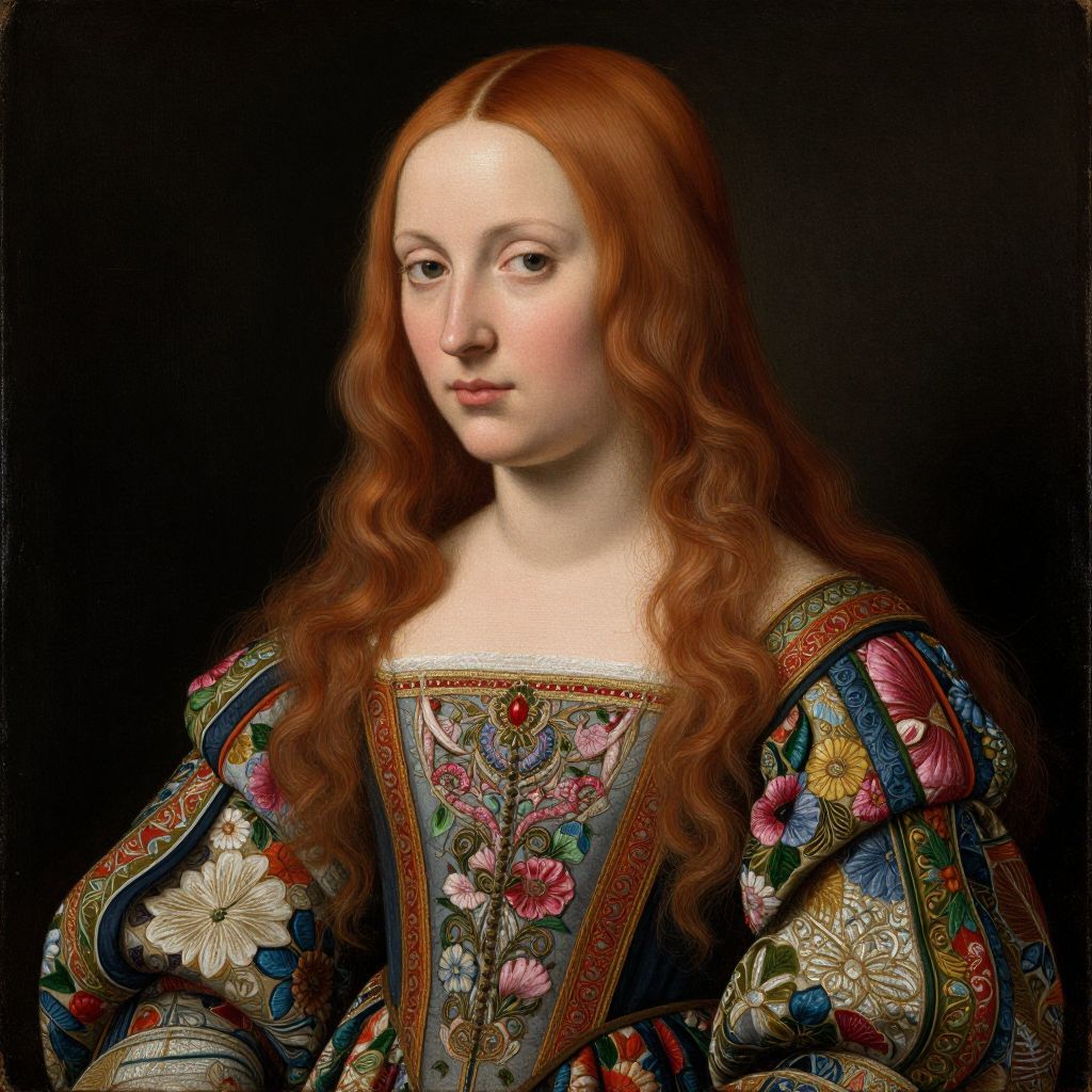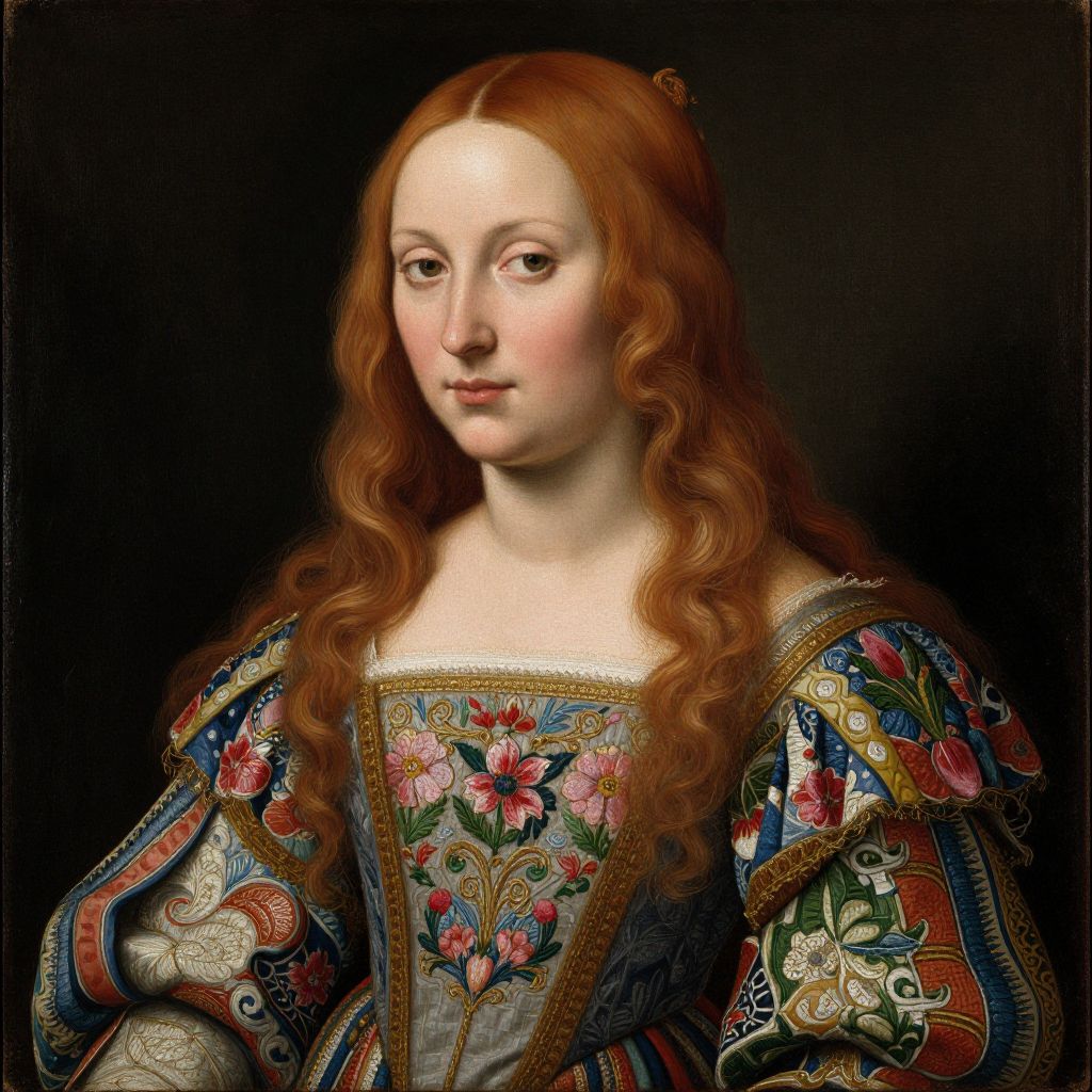 Renaissance portrait of a pale-skinned, red-haired woman with long wavy hair, wearing an ornately embroidered, colorful gown against a dark
