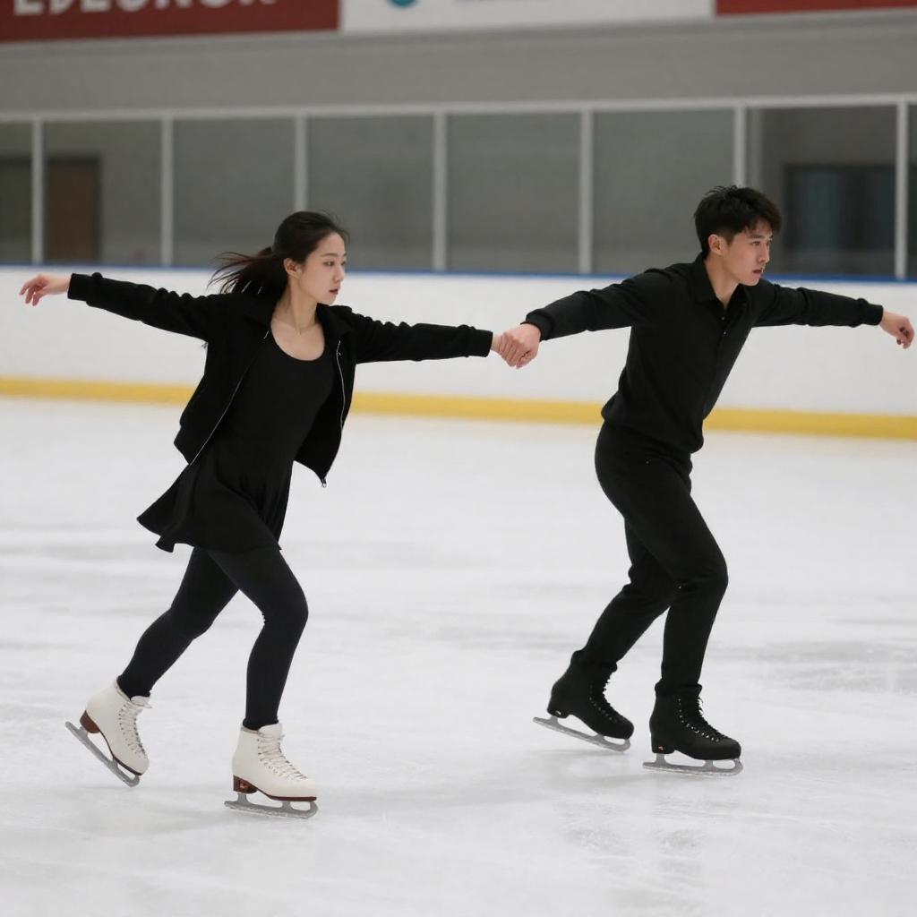 Asian couple ice skating indoors, wearing black outfits. Woman in black dress and jacket with white ice skates, man in black clothing with black ice skates. Both have arms extended and hold hands while skating on smooth ice surface. Background features glass windows and arena walls.