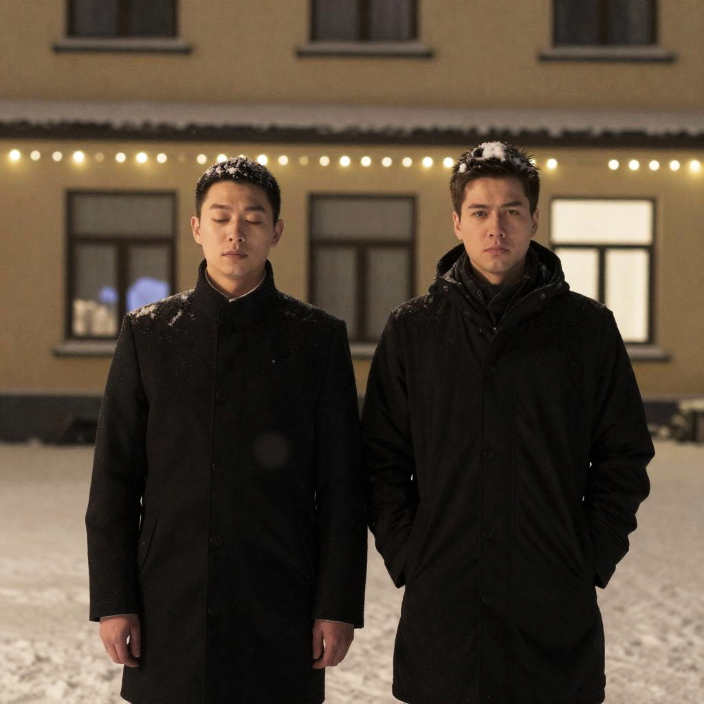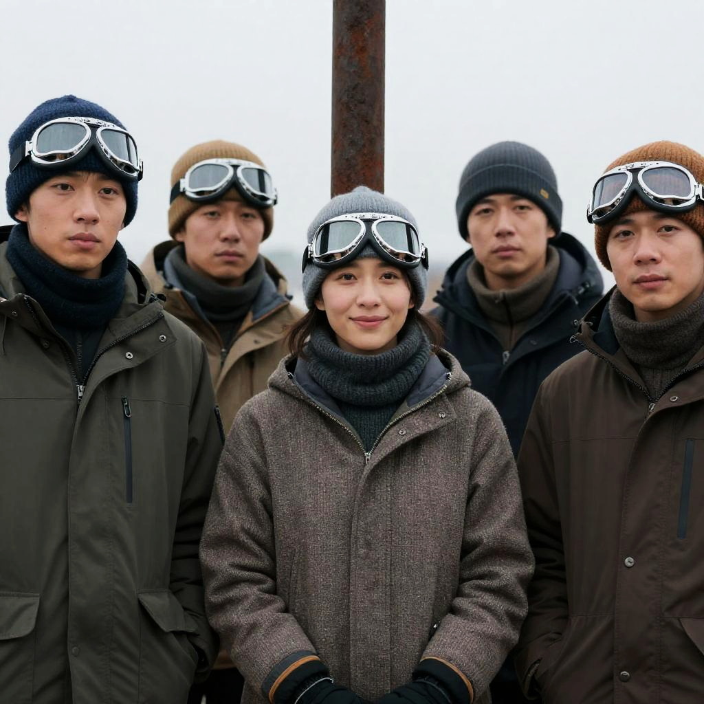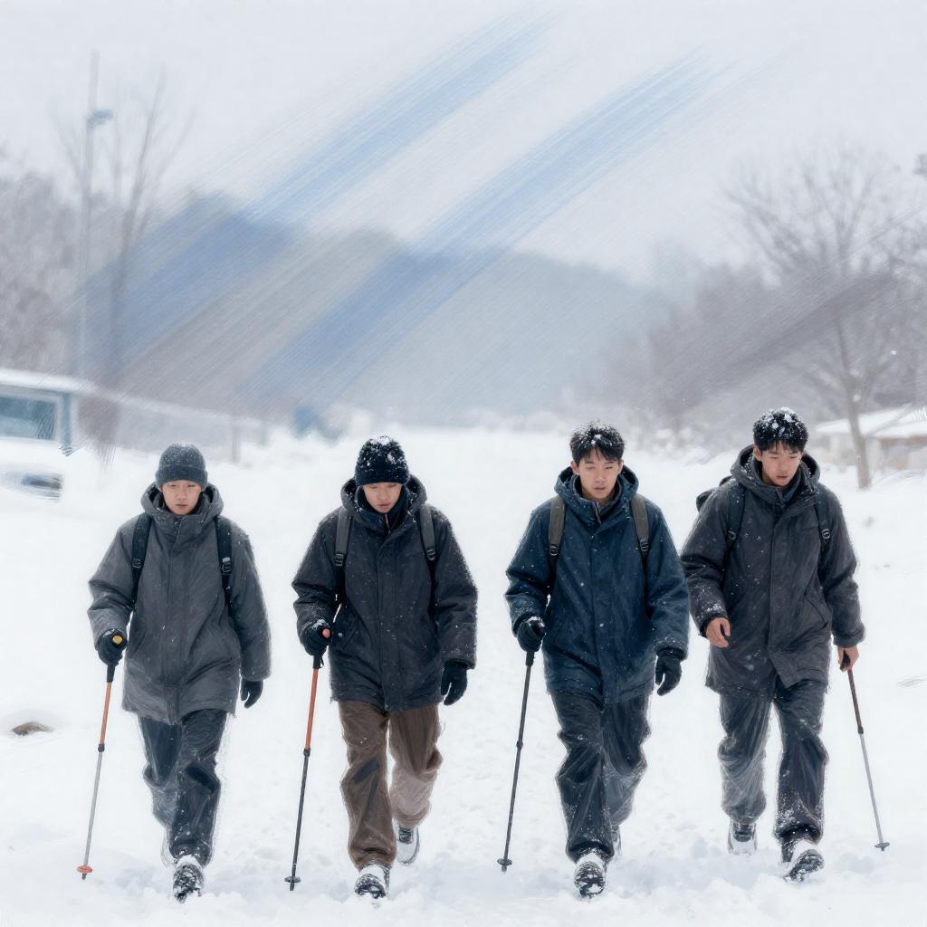 Digital sketch of four people in dark clothing, walking in a snowy landscape with strong, diagonal blue and white brushstrokes. Each person has a backpack and is holding a walking stick. Snow falls heavily. Intense expressions not visible.