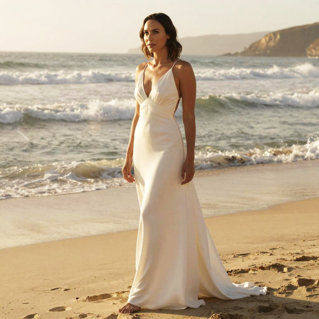 Photograph of a dark-haired woman standing on a sandy beach at sunset. She wears a white, sleeveless, V-neck, form-fitting wedding dress with a subtle sheen, accentuating her slender figure. The dress has a gathered waistline. She stands with her arms relaxed by her sides, gazing slightly to the right. The ocean waves gently crash in the background, with the sun casting a golden glow on the horizon. The beach is mostly empty, with a distant rocky cliff on the right. The image has a warm, romantic ambiance.