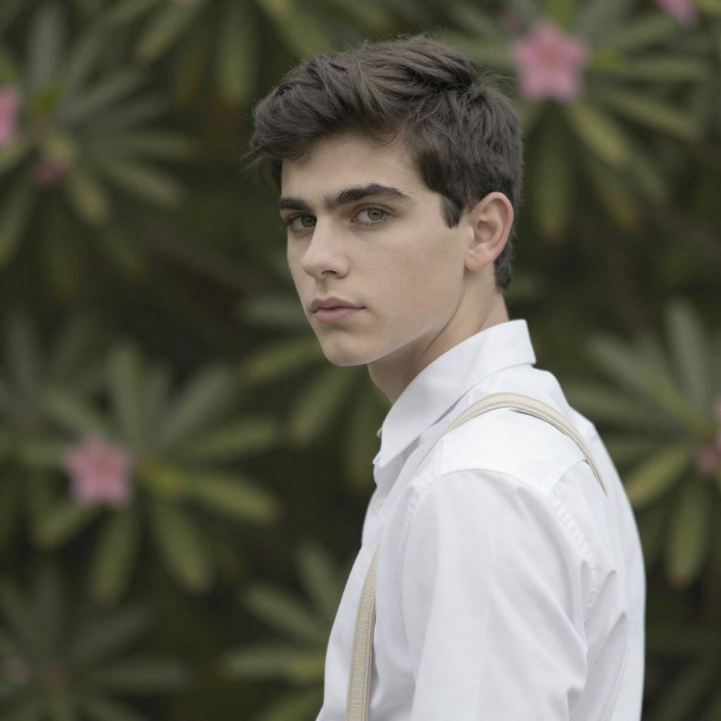 Photograph of a young man with short dark brown hair, light skin, and green eyes, wearing a white shirt with beige suspenders. He looks over his shoulder with a neutral expression. Background: blurred green foliage with a few pink flowers. He is positioned slightly to the right.