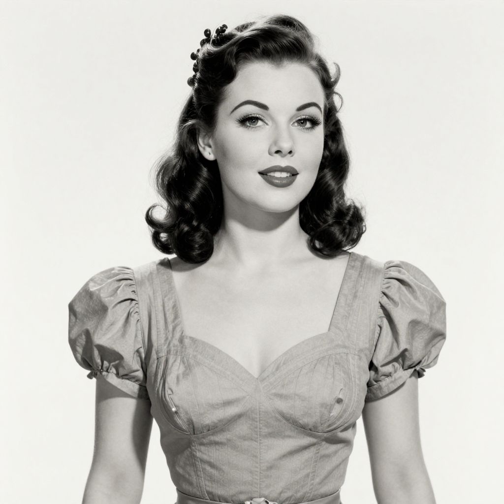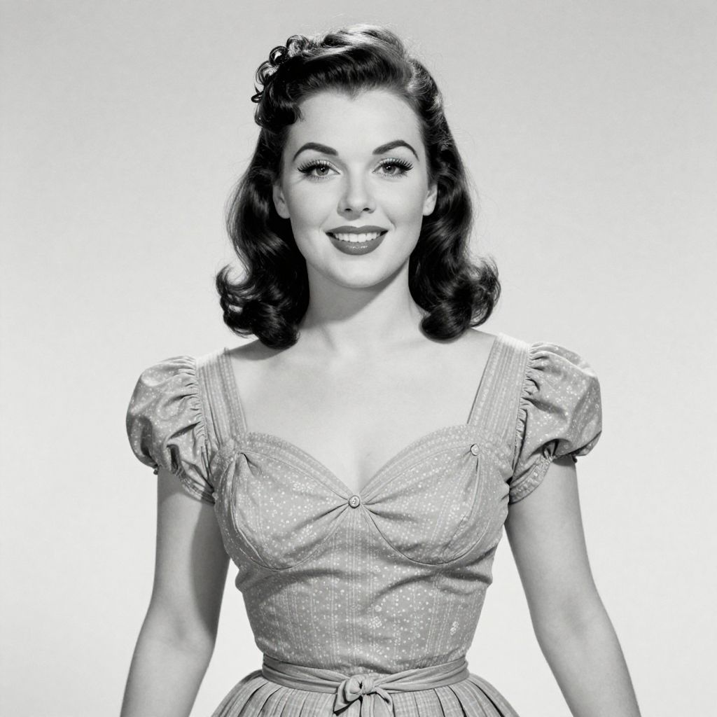Black-and-white photograph of a 1950s-style woman with curled hair, wearing a puffed-sleeve, V-neck dress, and dark