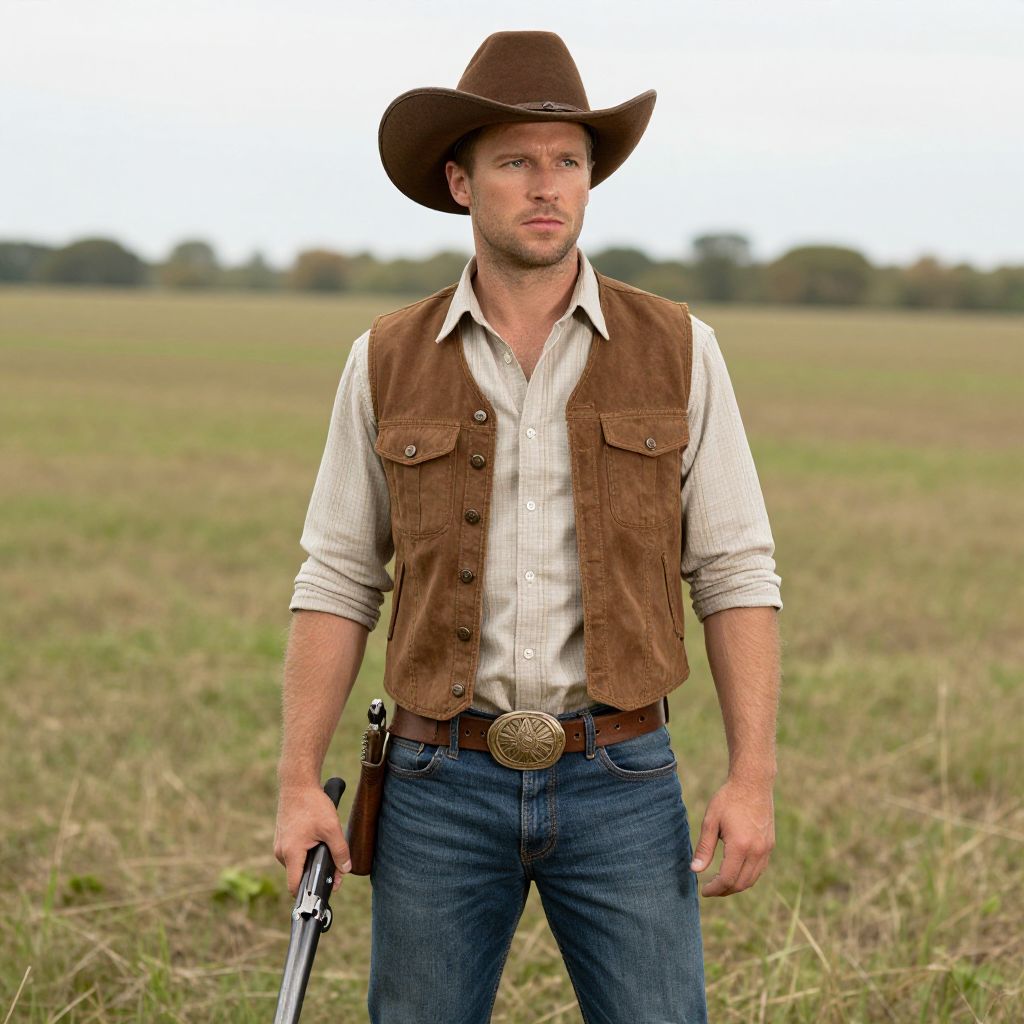 A man dressed in a cowboy outfit stands in an open field. He is wearing a brown cowboy hat, a brown suede vest over a light-colored shirt with rolled-up sleeves, blue jeans, and a large belt buckle. He is holding a double-barrel shotgun in one hand and has a holstered pistol on his belt. The background shows a grassy field with a blurred tree line in the distance under a cloudy sky.