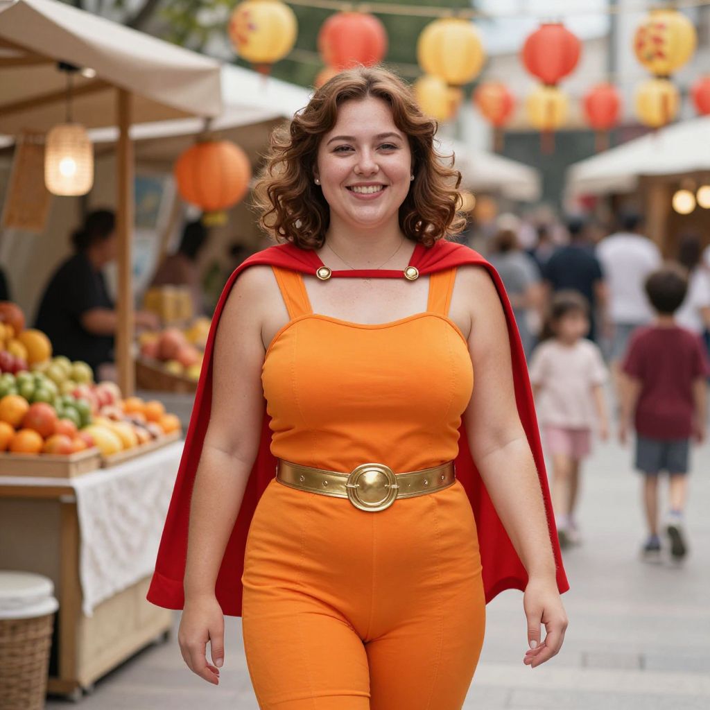 A cheerful woman in her 30s with a round face, natural brownish skin, and soft brown curls is dressed in a vibrant orange costume outfit — a full orange jumpsuit with a red cape and a golden belt — standing in a festive outdoor market with fruit stalls, paper lanterns, and children playing in the background.. The woman has big tits and cute face
