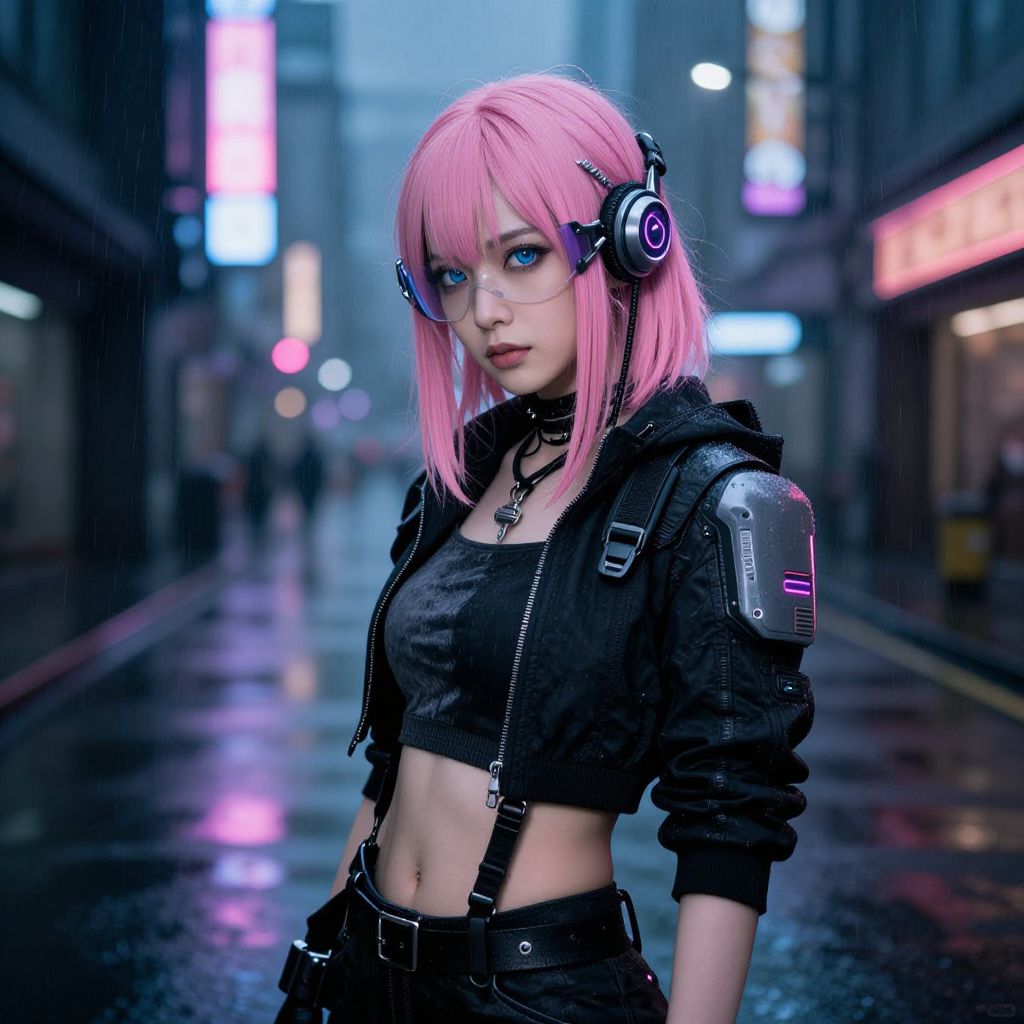 Cyberpunk pink hair blue eyes woman with high-tech goggles in a rainy urban environment, reflective wet pavement, neon signs in background, detailed futuristic outfit, moody cinematic lighting, gritty yet vibrant aesthetics