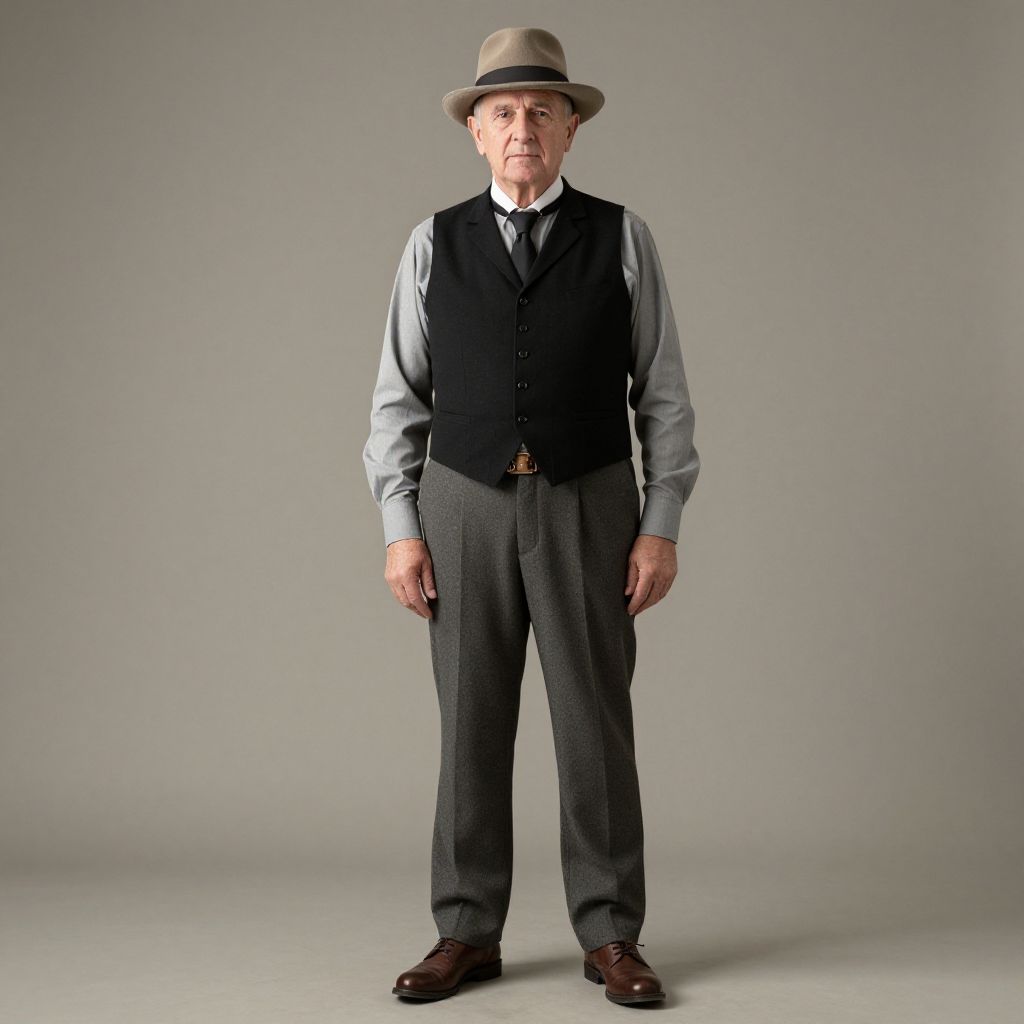 An elderly man stands confidently against a neutral background, dressed in vintage-style clothing including a beige hat, gray shirt, black vest, and gray trousers. His ensemble, completed with brown leather shoes and a belt, evokes a classic, timeless look reminiscent of early 20th-century fashion.