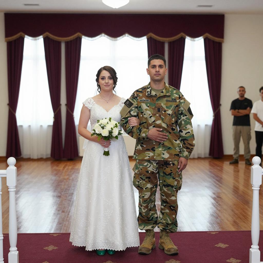 Man in green military uniform with medals, standing, toasting with woman in white sweater and navy skirt. Woman holds bouquet, smiling, looking up at man. White ornate doors, floral arrangement, gold arch, table with glass and papers. Both standing close, man on left, woman on right. Background details include wooden floor, white walls, ceiling molding. Woman's long blonde hair, man's short black hair. Man's right hand raised, pointing towards woman's face. Woman's head tilted up.