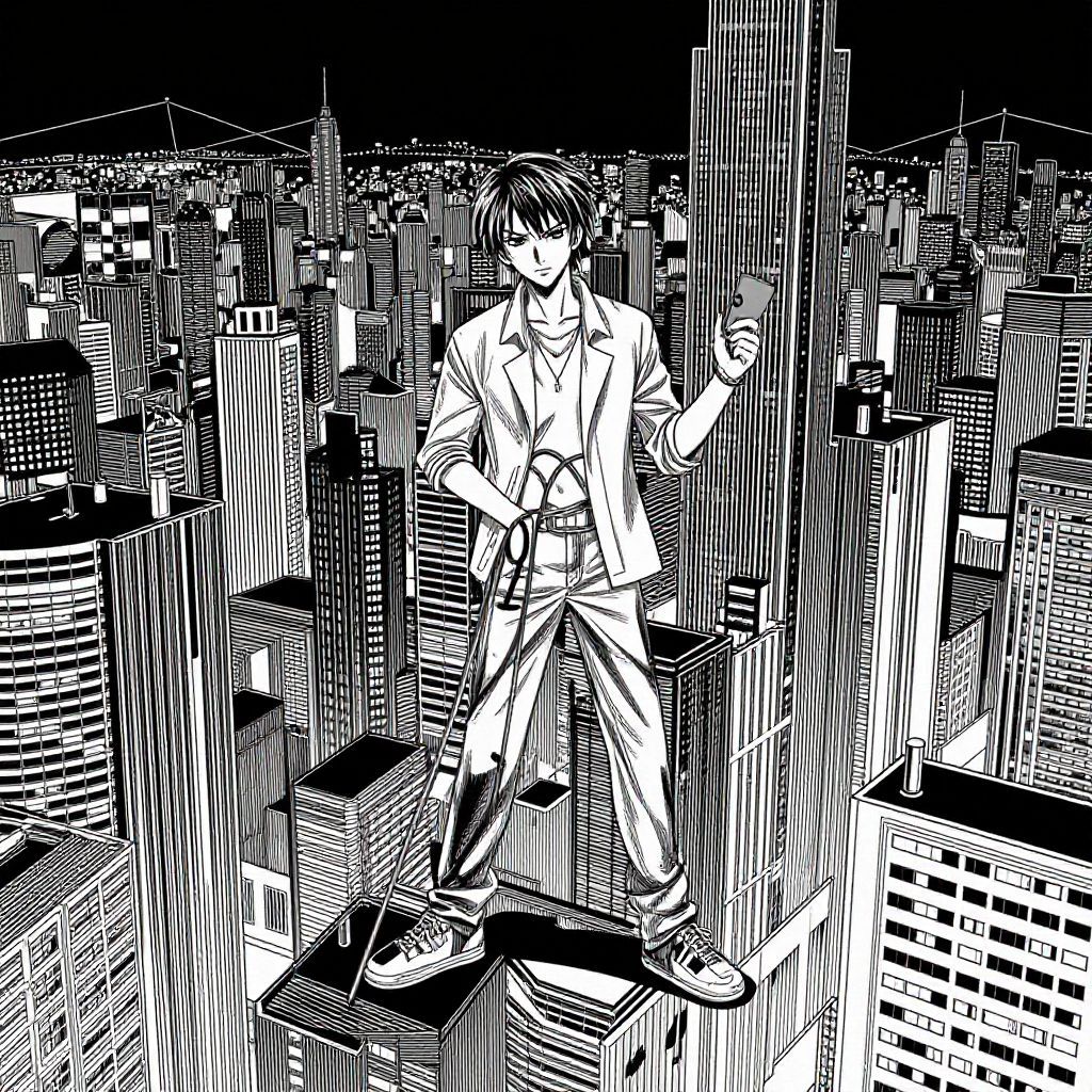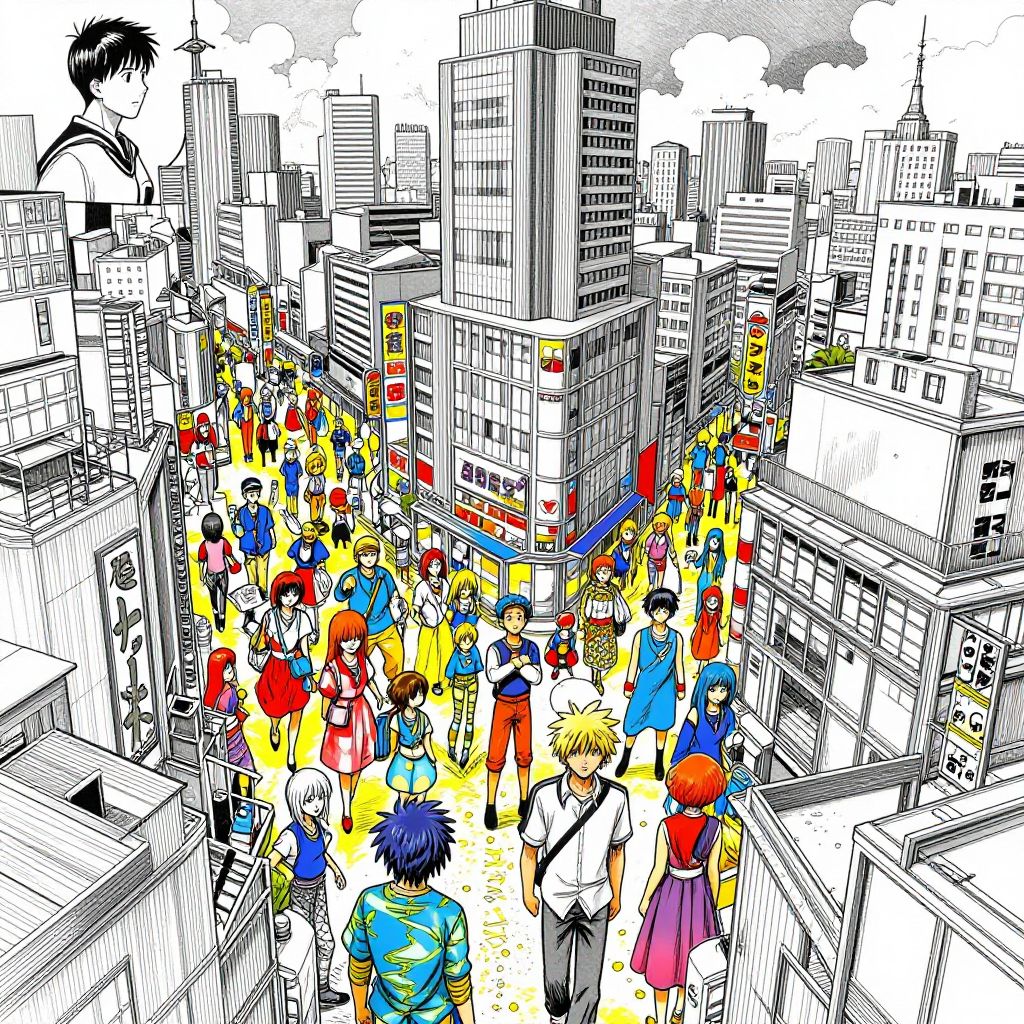 A vibrant manga colorizer scene showing a detailed manga cityscape coming alive with bright colors, bustling characters, and animated effects, capturing the essence of storytelling and imagination as black and white drawings burst into colorful expressions.