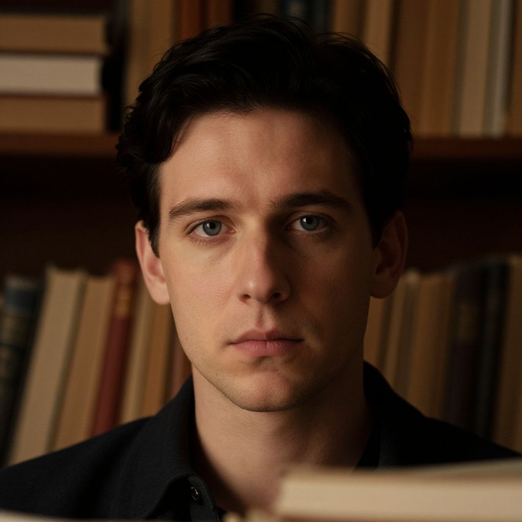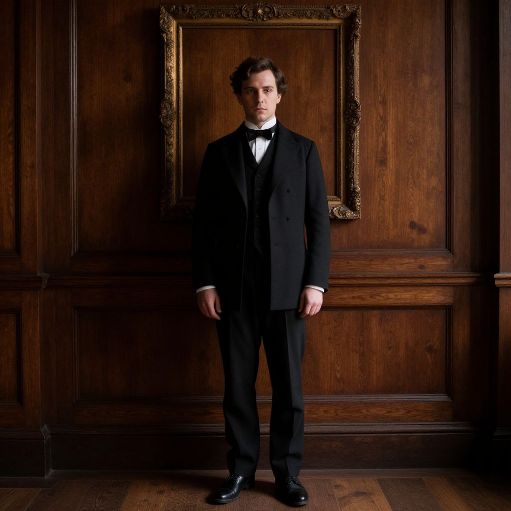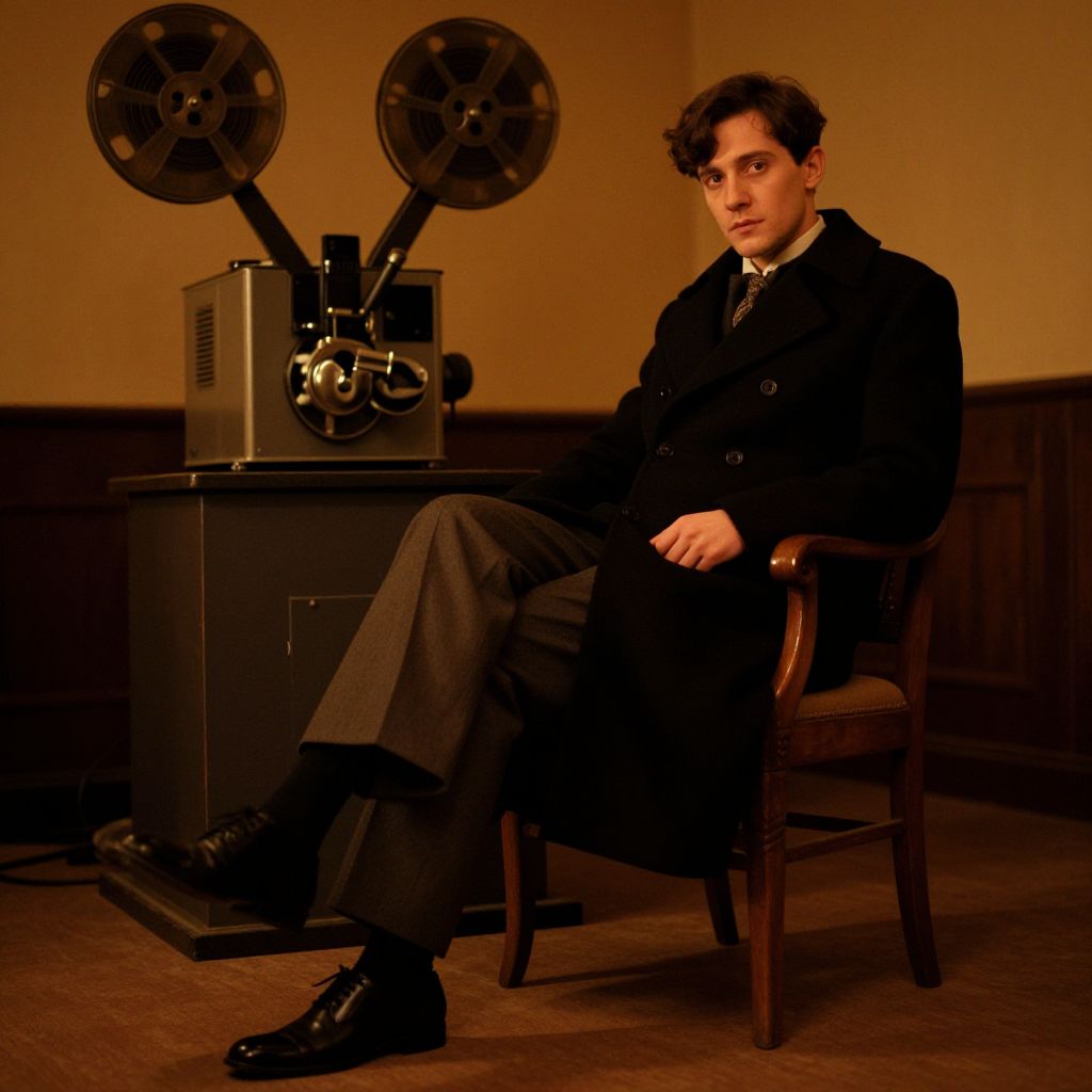 A vintage cinema scene with a man in a long black coat and elegant pants sitting on a wooden chair, old film projector in background, grainy film aesthetic, warm amber lighting, nostalgic mood, MidJourney style.