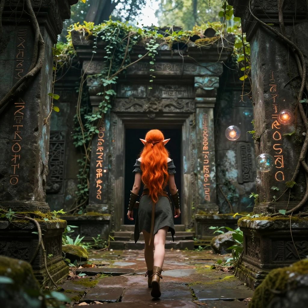 Digital fantasy artwork: elf girl with long, flowing red hair, back facing, walks through ancient, moss-covered ruin entrance, glowing lights on stone walls