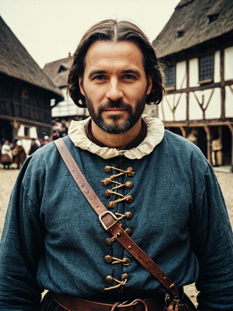 Man in Medieval Peasant Costume, photorealistic historical cosplay portrait