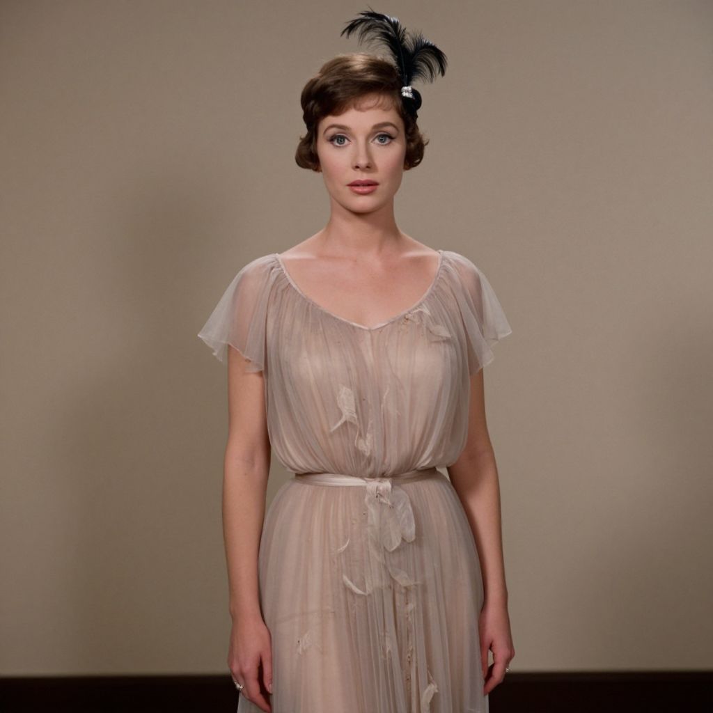 Elegantly poised woman wearing a Chanel Haute Couture dress featuring chiffon, feathers, and tulle with flouncing open shoulders, complemented by a twenties headband adorned with a single feather, embodying the classic style of Daisy as portrayed by Mia Farrow in 1974.