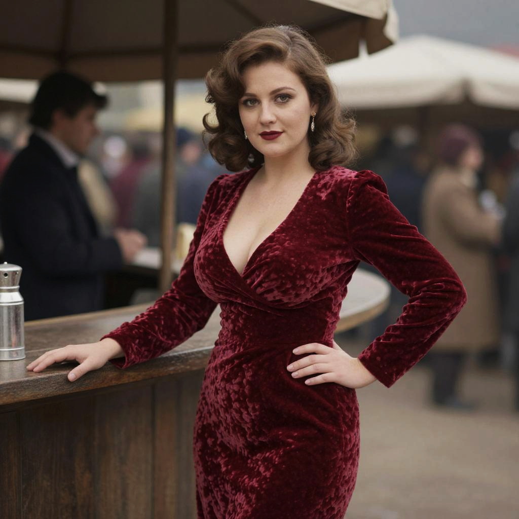 A curvy woman in a deep red velvet dress with long sleeves and a plunging V-neckline stands gracefully at an outdoor bar in a bustling market, captured in a hand-tinted photograph. Sexy. Pretty face and beаutiful eyes. Big breasts