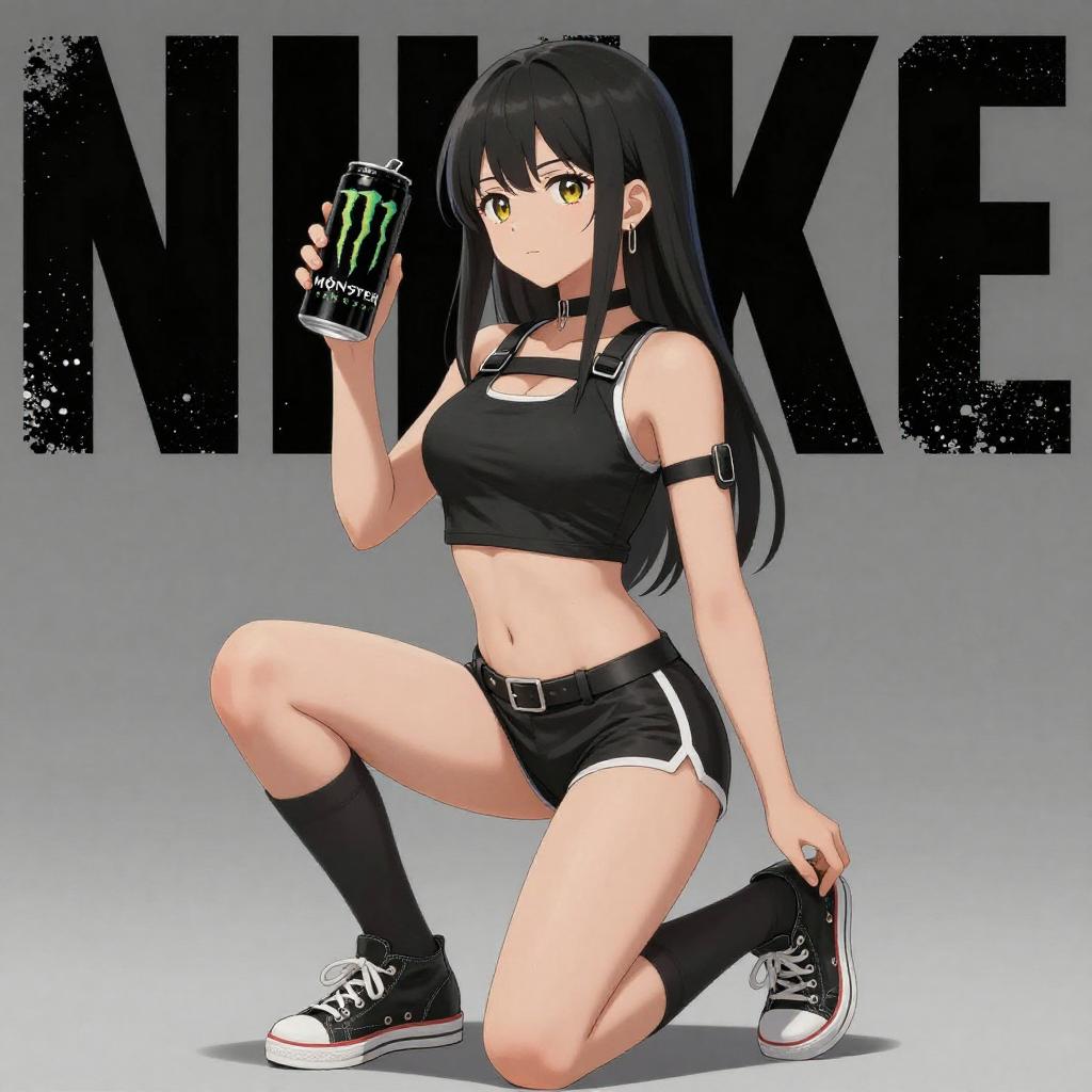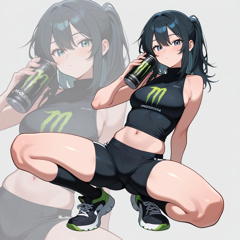 1girl, IncrsNikkeProfile, full body, zoom layer, one knee, HoldingMonsterEnergy, holding, can, holding can