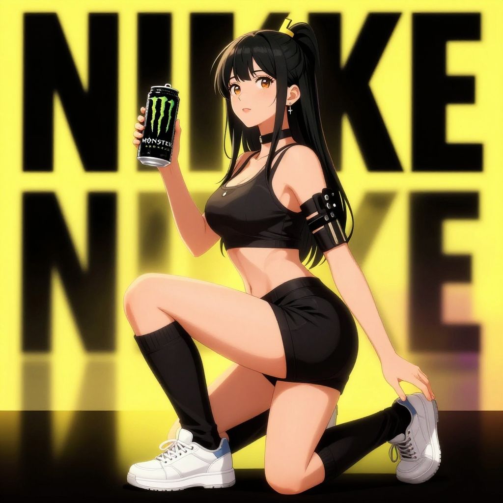 Digital anime-style drawing of a young woman with long black hair and golden eyes, kneeling on one knee. She wears a black crop top with straps, black shorts with white trim, black knee-high socks, and black high-top sneakers. She holds a can of Monster energy drink in her right hand. The background is a gradient from light to dark gray with the large, bold, black letters "NIKE" behind her. The image has a clean, modern look with sharp lines and vibrant colors.