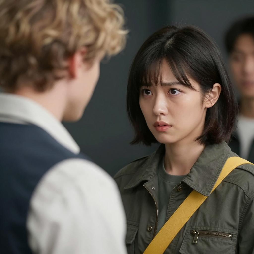 Photograph of three people at a table. Woman in red shirt on left, looking to the side. Man in gray shirt in center, intense expression, looking at another man. Man in plaid shirt on right, back to camera. Desk with papers in foreground. Blurred bookshelf in background. Warm lighting.