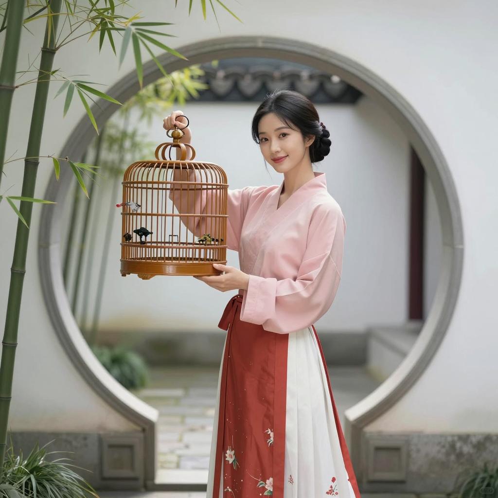 Asian woman with black hair styled in a bun wearing a pink long-sleeve top and a red and white embroidered skirt, standing inside a circular stone archway. She is holding a small wooden birdcage and smiling gently. The setting includes green bamboo plants and a blurred traditional architectural background, evoking an East Asian cultural atmosphere.