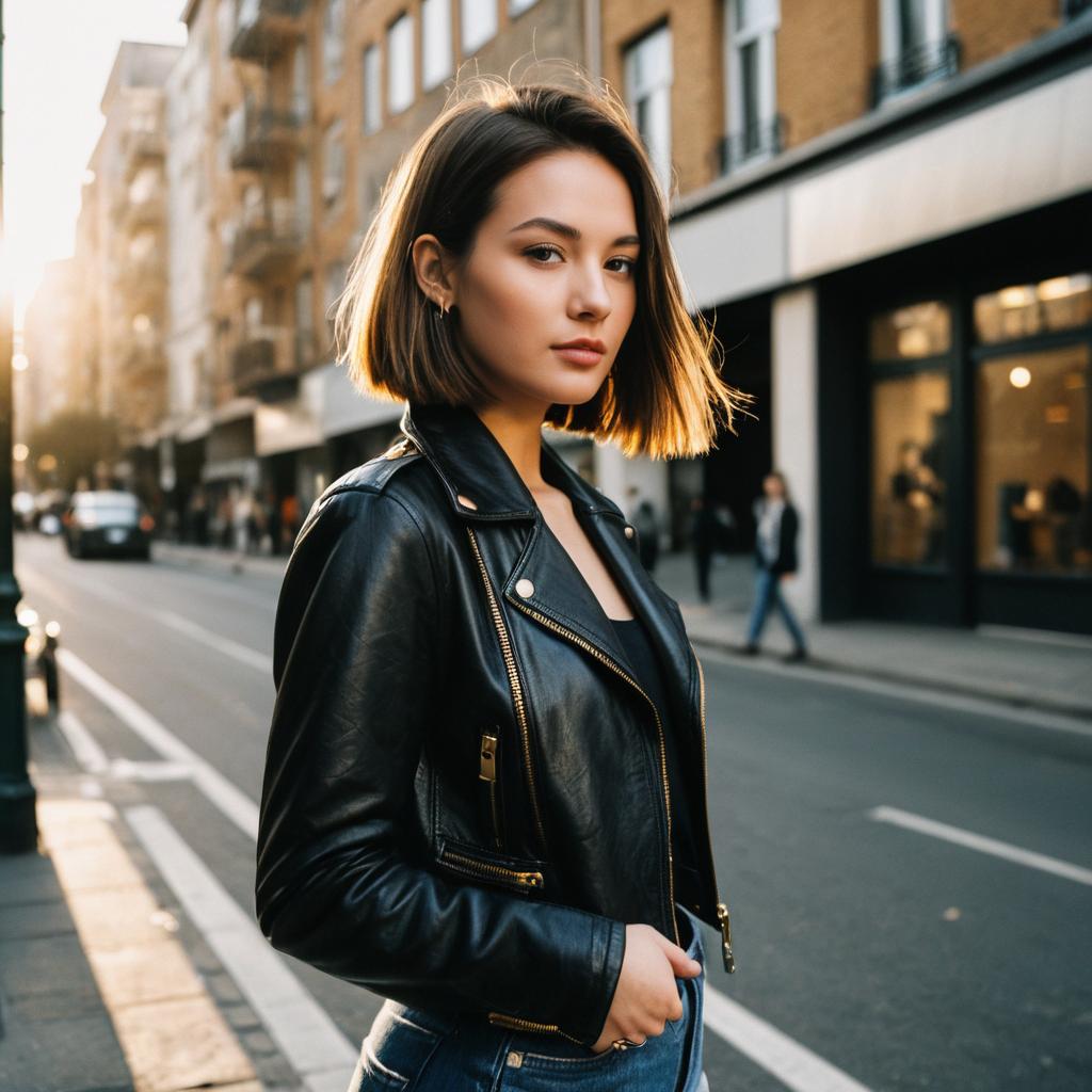 Woman, modern urban, high-neck sleeveless crop top in a neutral tone, A-line mini skirt in vibrant yellow with front button detail, long fringe brown leather satchel, minimalist bangle. --sref 1447