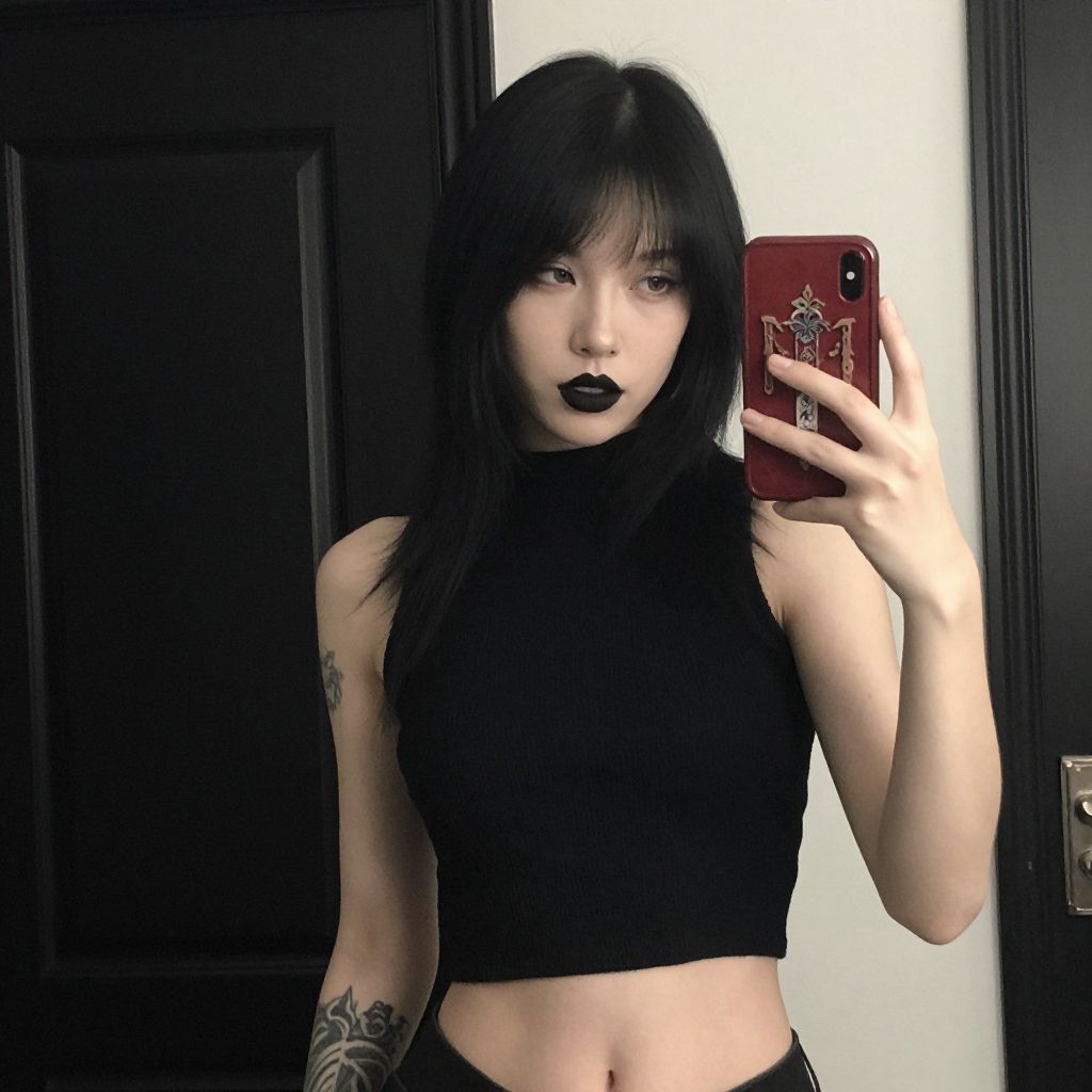 Gothic-style photograph of a pale-skinned woman with black lipstick, straight black hair, sleeveless black crop top, holding red phone, tattoo