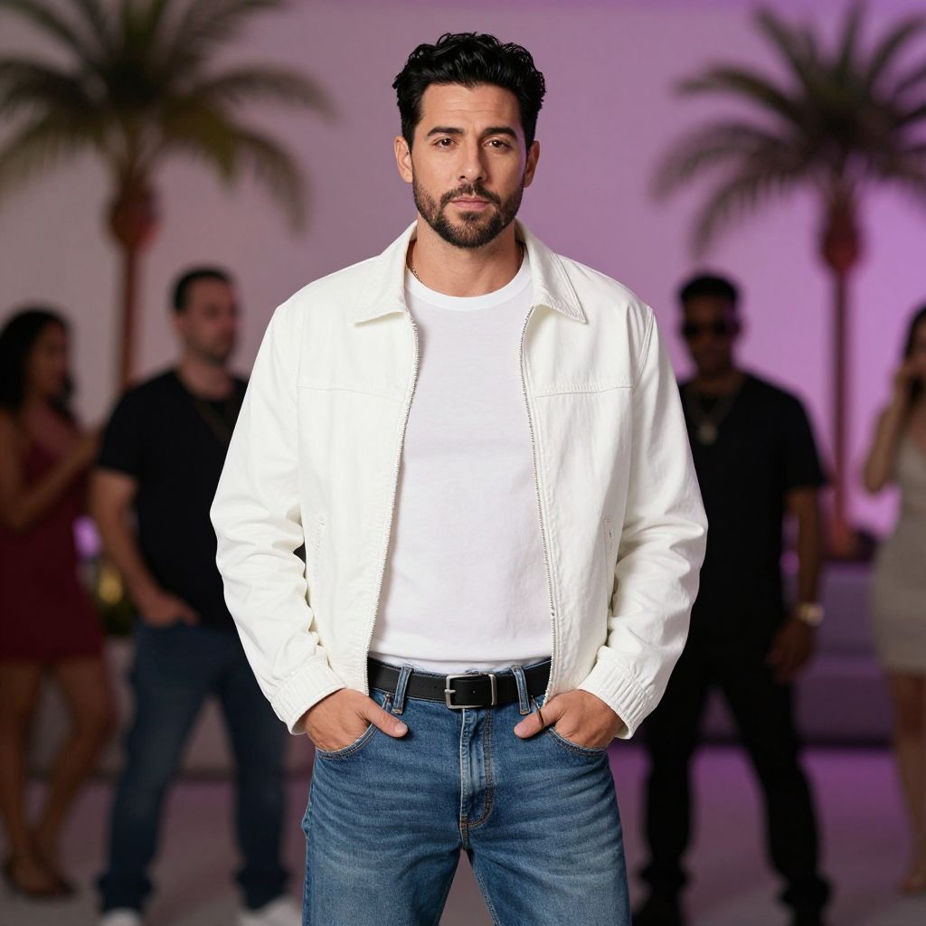Miami vice party theme, 1boy, male focus, hands in pockets, facial hair, shirt, belt, pants, palm tree, jacket, solo, white jacket, black hair, blurry, realistic, blurry background, denim, jeans, beard