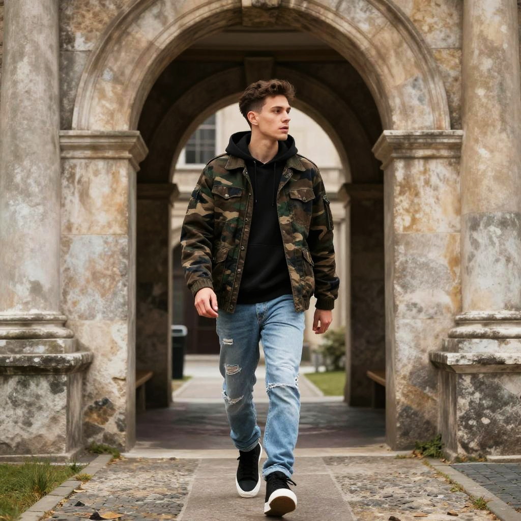An artistic portrayal of a young man confidently walking through an ancient stone archway, dressed in trendy urban attire with a camouflage jacket.