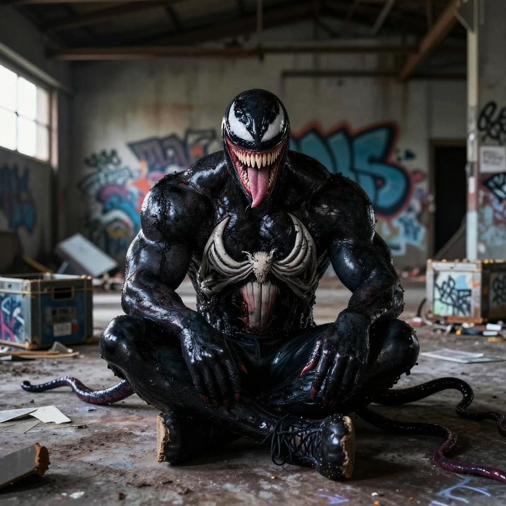 Venom sitting cross-legged in an abandoned warehouse, surrounded by scattered graffiti and broken crates, tendrils creeping over the floor, his intimidating expression softened by shadow play, dark and moody color palette, hyperrealistic texture and lighting.