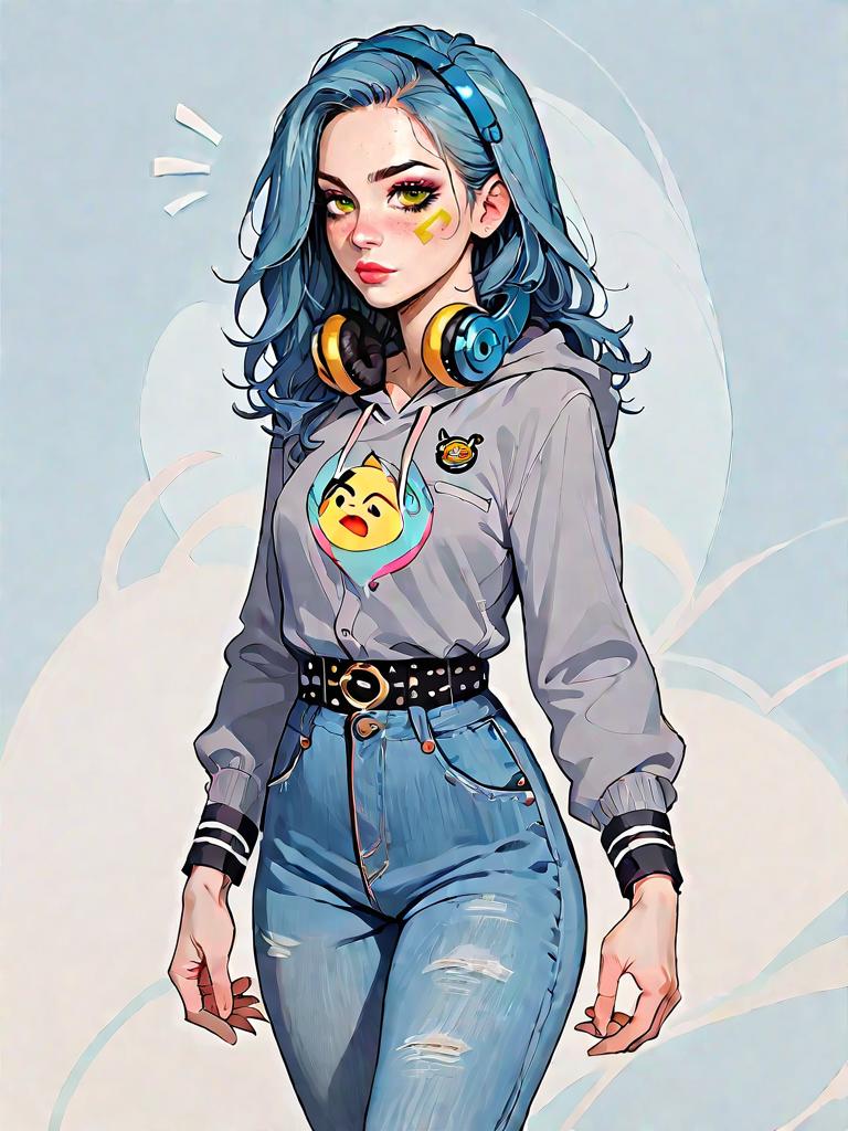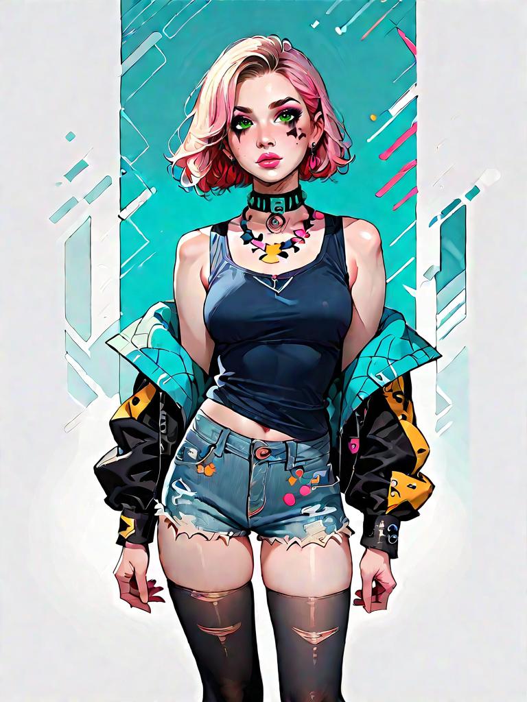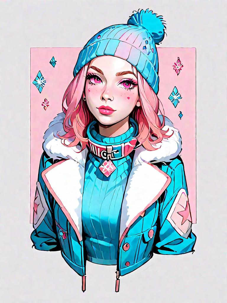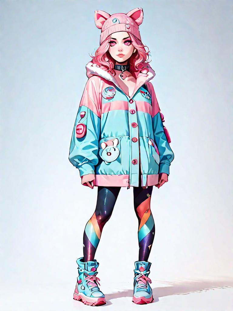 Full-body digital illustration of a young woman wearing a glossy metallic pink and blue oversized puffer jacket with an oversized collar, matching pink beanie with cat ears, and coordinating faux fur muff. She has pink hair and a black choker, paired with colorful slim-fit textured leggings and blue combat boots accented with pink laces. The background is a plain photo studio setting.