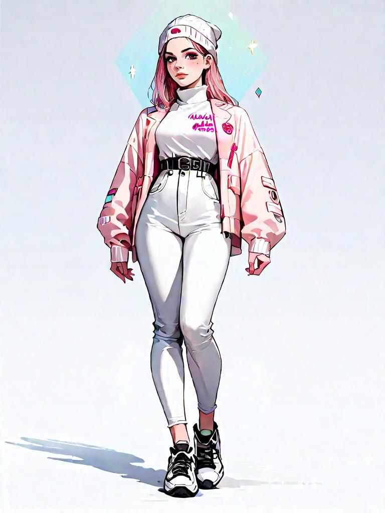 1girl, source_comics, realistic face, full body shot, Woman, modern winter chic, glossy metallic pink puffer jacket with oversized collar, matching pink beanie, coordinating faux fur muff, slim-fit textured leggings in a lighter pink shade, photo studio background.