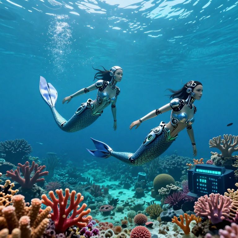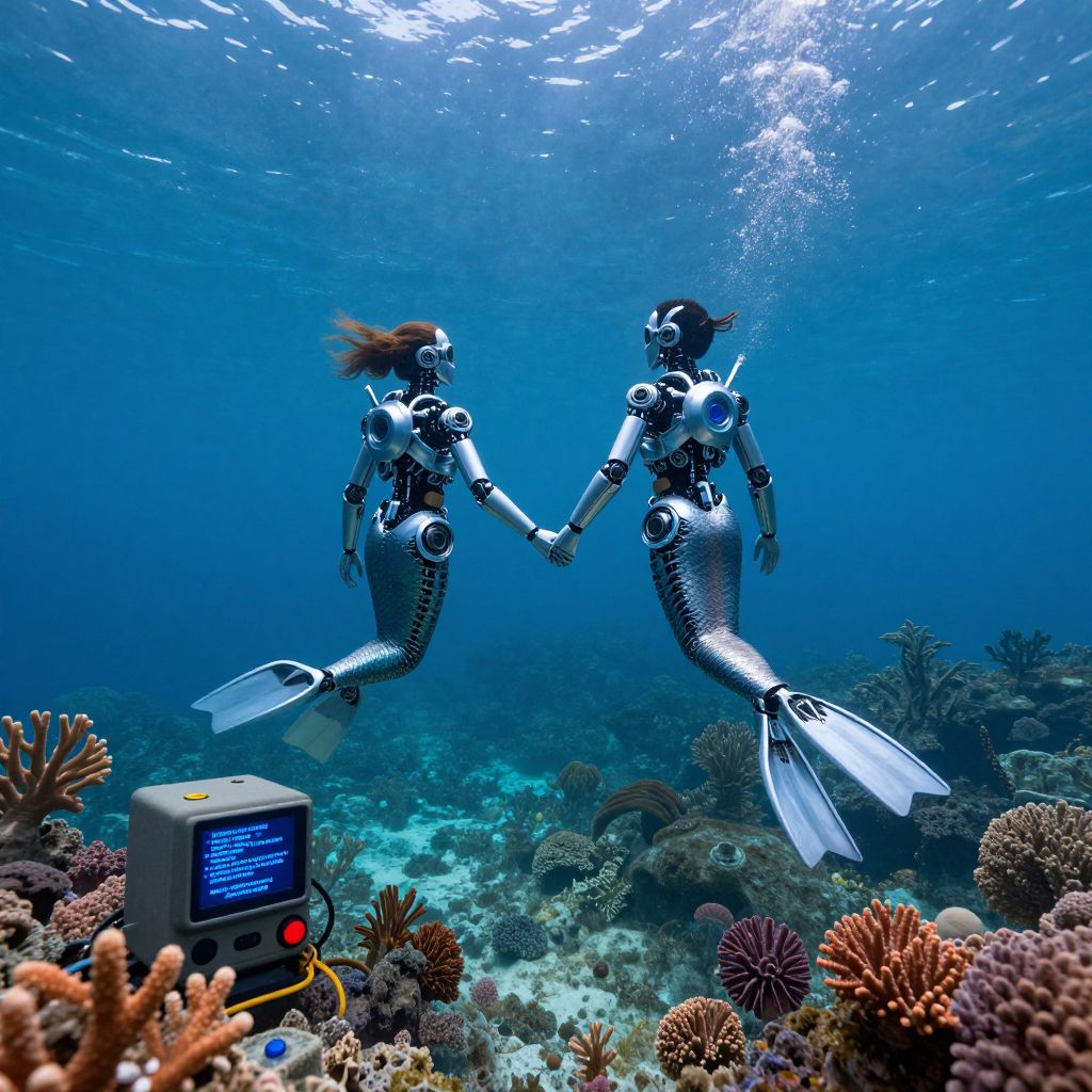 In a serene underwater realm where technology and nature intertwine, two mermaids adorned with sleek mechanical exoskeletons glide hand-in-hand, their journey symbolizing the delicate balance between human ingenuity and the ocean's timeless wisdom, as they salvage forgotten memories encoded within vibrant coral servers, evoking a profound sense of hope and connection amidst the depths of mystery.