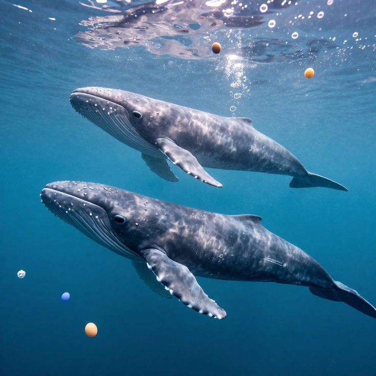 Velvet-skinned sky-whales glide gracefully through a serene underwater world, surrounded by floating eggs and delicate bubbles, their forms bathed in soft, ethereal light.
