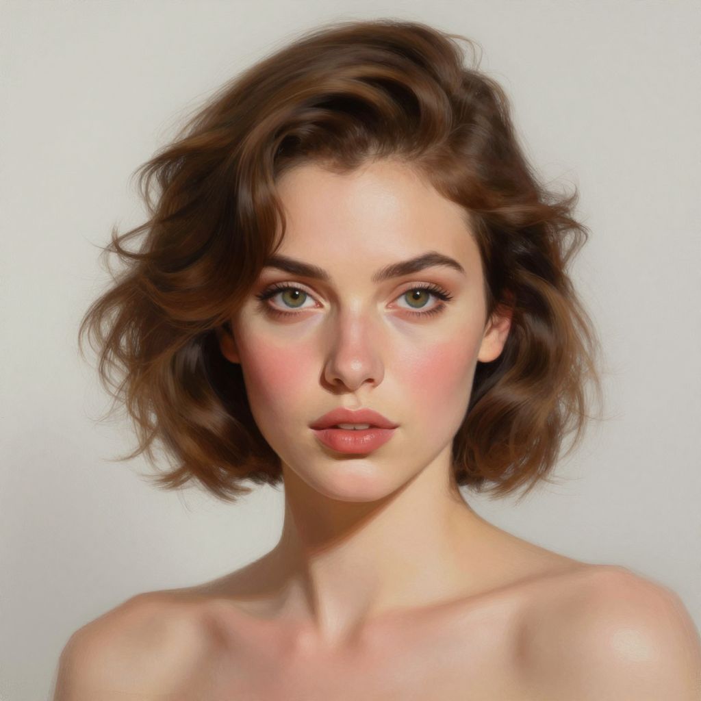Victor Lozada's digital painting portrays a captivating figurative art portrait of a woman with short, wavy brown hair styled elegantly, featuring striking green eyes, defined eyebrows, and soft blush highlighting her cheeks, all set against a minimalist background, exuding a timeless elegance and charm.