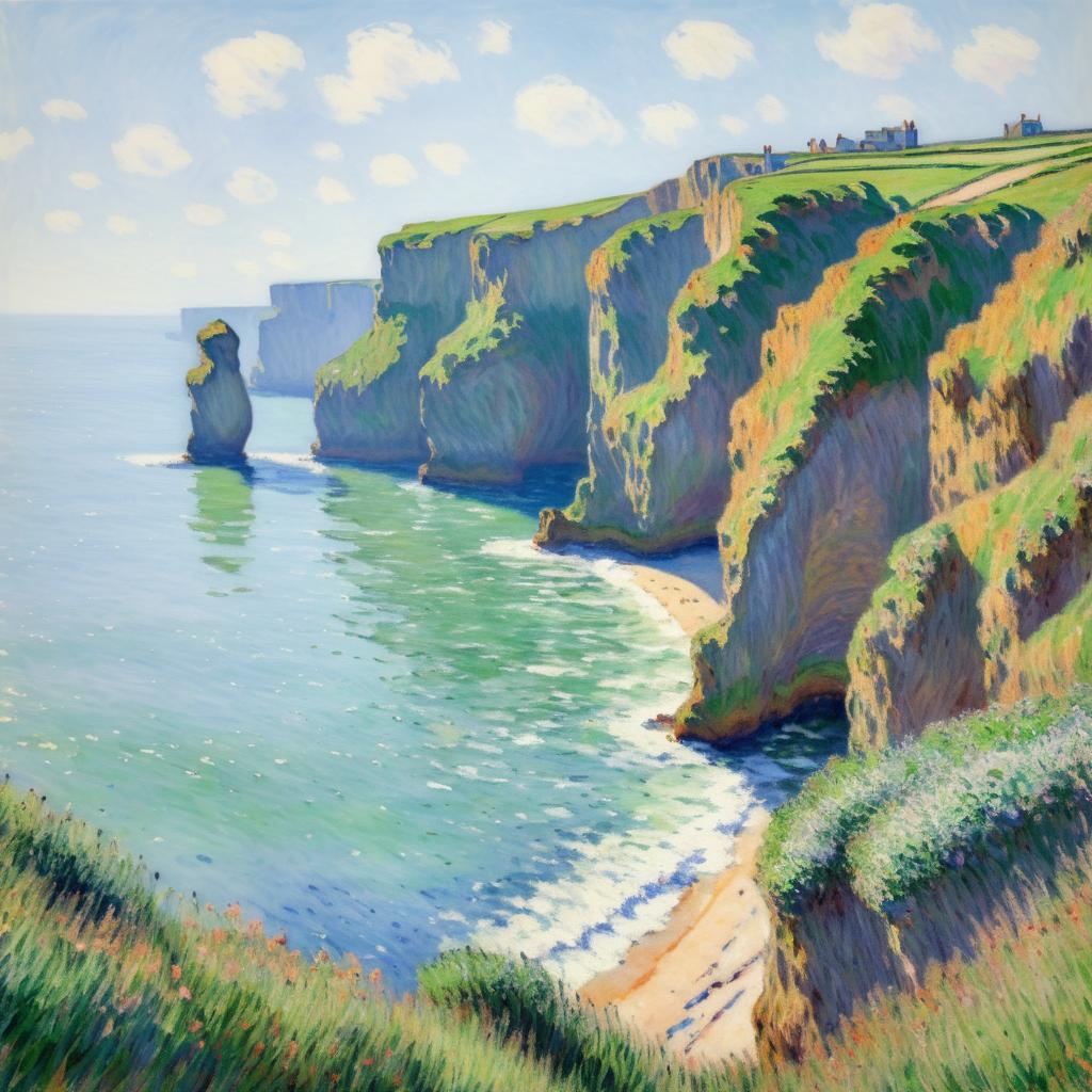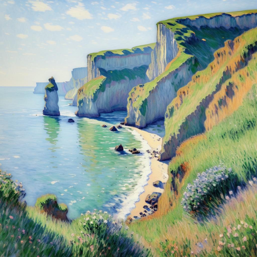 Detailed illustration of coastal cliffs by Claude Monet, showcasing a serene landscape.