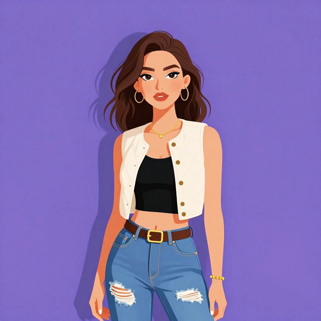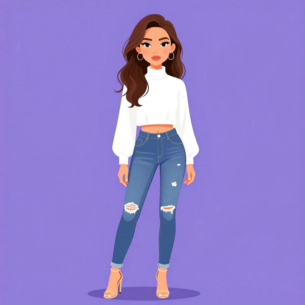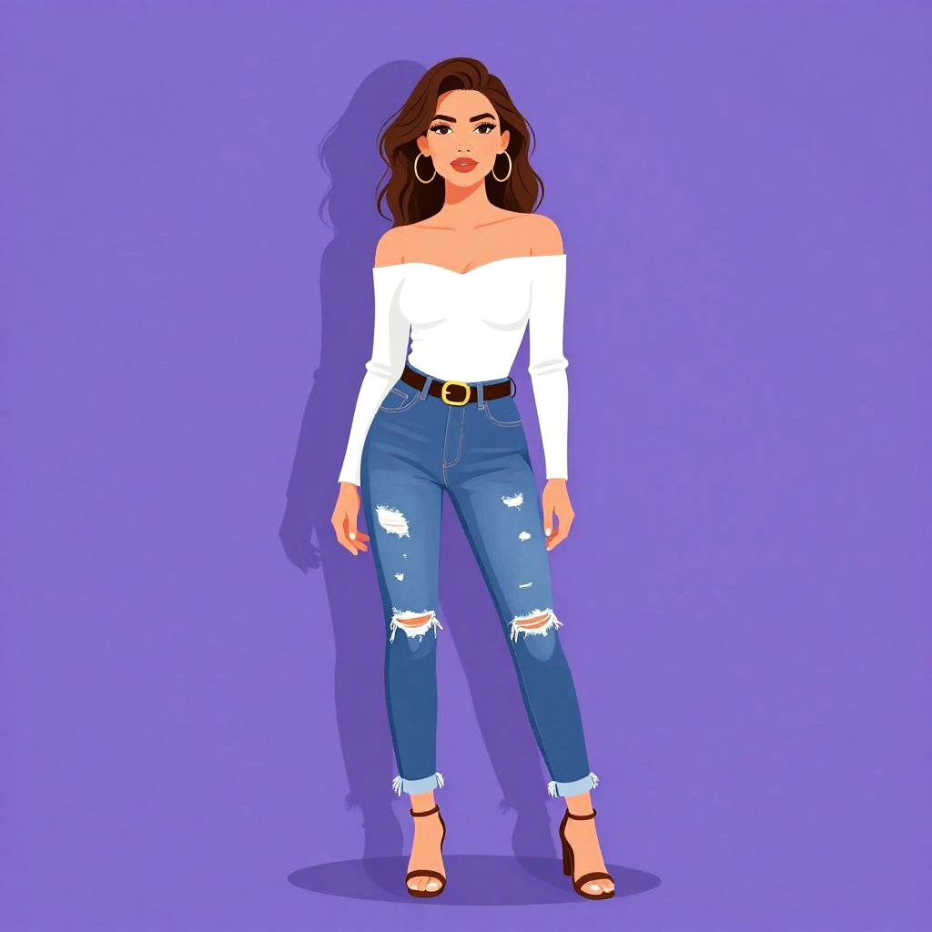 Woman with pretty face and pretty hair. Woman, casual, sleeveless white peplum top, scoop neckline, fitted at the waist, flared hem, dark blue skinny jeans, gold layered necklace with pendant, gold bangle bracelets. --sref 1467