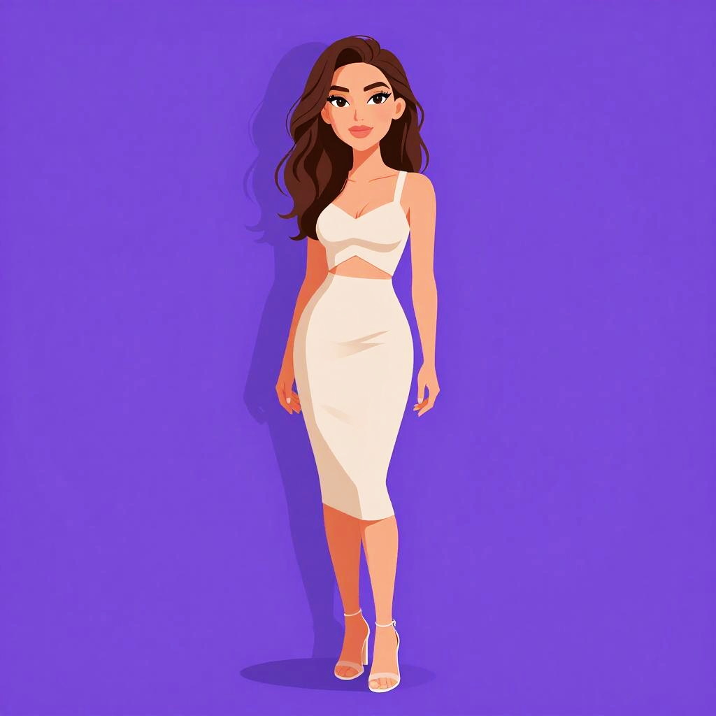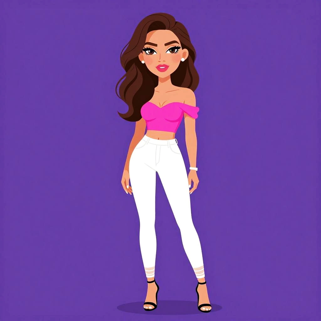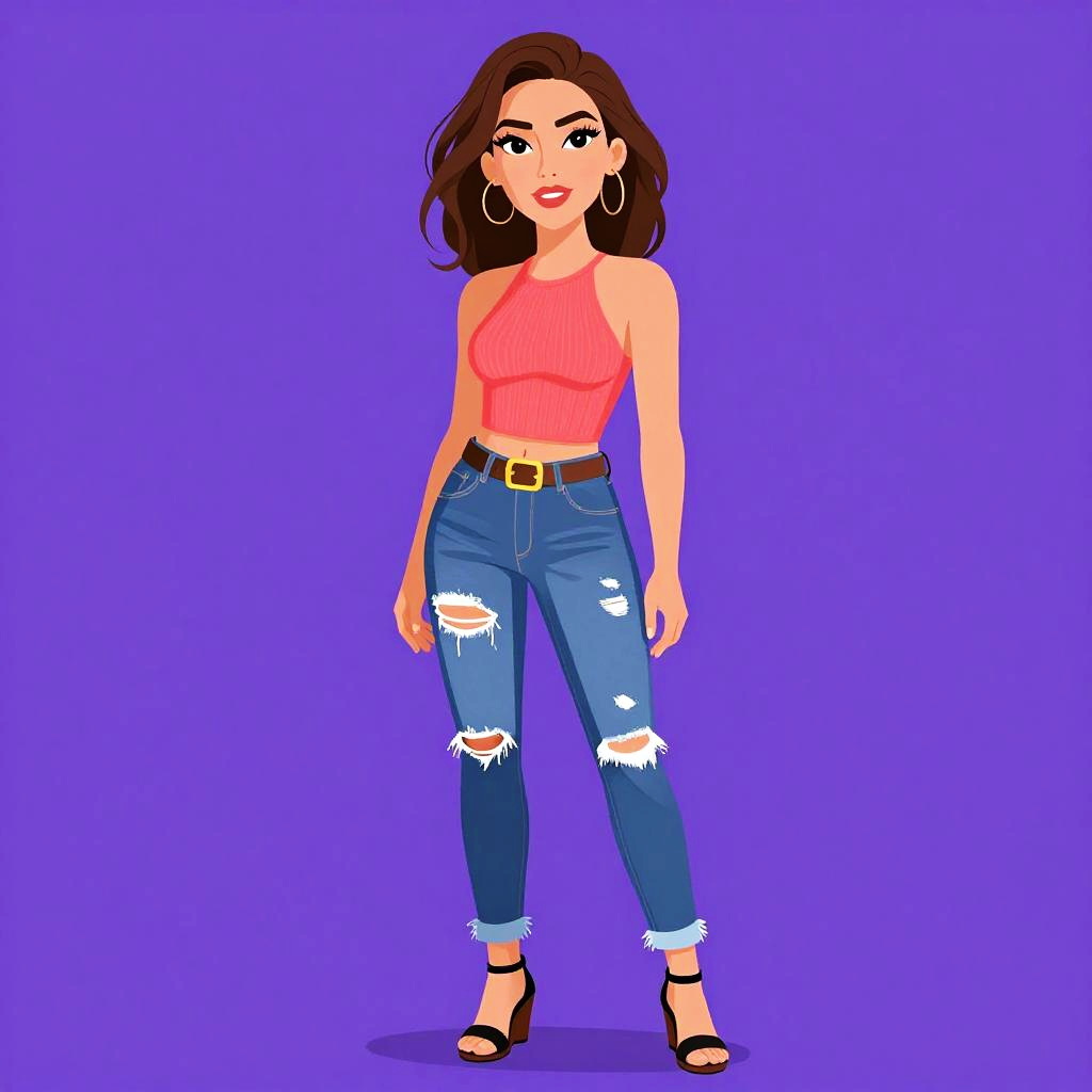 Woman with pretty face and pretty hair. Woman, casual, sleeveless white peplum top, scoop neckline, fitted at the waist, flared hem, dark blue skinny jeans, gold layered necklace with pendant, gold bangle bracelets. --sref 1467