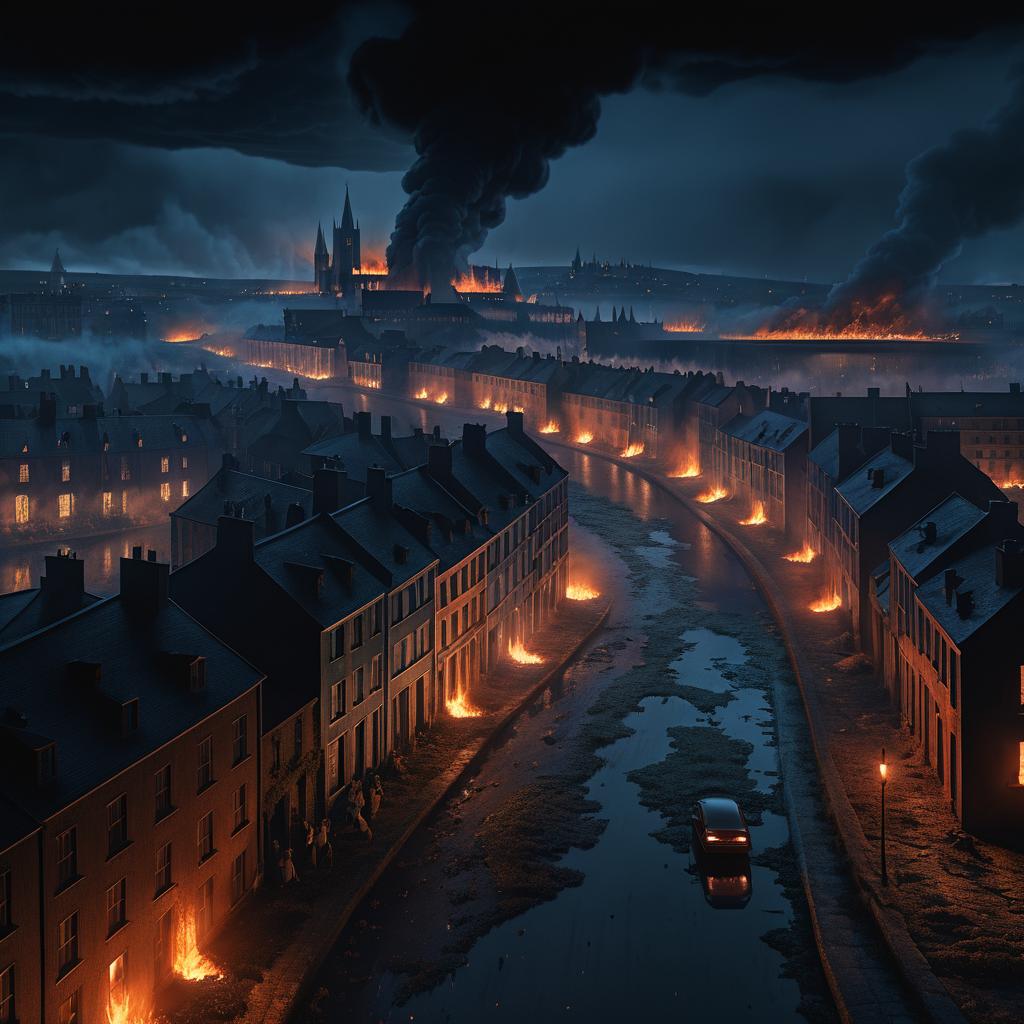Masking Fluid RAW photo of people fleeing in terror through Drogheda Ireland at night, burning buildings in background, town on fire, panoramic photo, occult, doomsday, hyperreal, masonic, tove jansson, demons, eyes, jim woodring, beksinski, gregory crewdson style, dark souls, 8k, high detail, volumetric lighting, visions of hell, hyper detailed, ultra realistic, cinematic lighting, masterpiece, 8k uhd + enhanced quality,