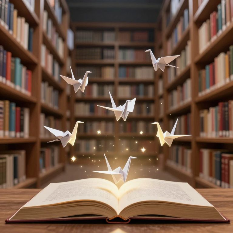 Origami cranes gracefully ascend from an open book, illuminated by magical starlight, as they float between towering wooden shelves filled with colorful books in a serene celestial library.