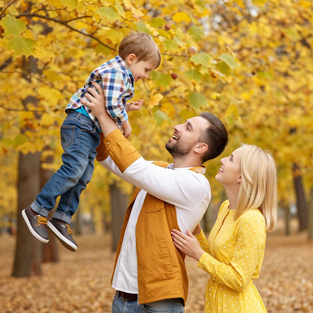 A colorful photo of a happy family in an autumn park. A bearded man with short brown hair, wearing a white shirt and orange jacket, lifts a small boy in a plaid shirt and blue pants. The boy holds a yellow leaf. A blonde woman in a yellow polka-dot dress smiles at them. The background is filled with golden-yellow trees, creating a warm, cheerful atmosphere.
