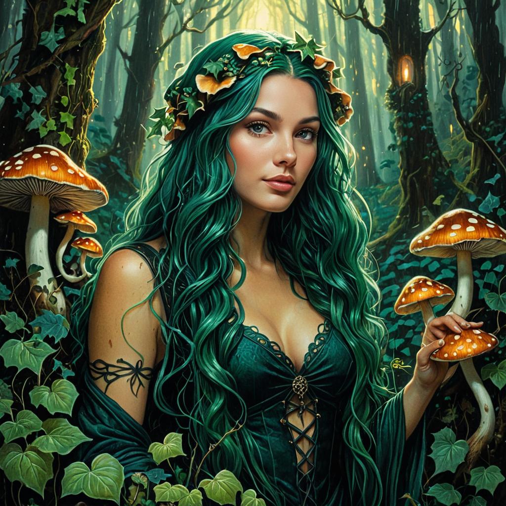 Drawing with colored pencils in romanticism of a chic sweet melancholic sorcerer entwined with frost-covered branches, set against the backdrop of a snowy northern pine forest, featuring pale icy skin, long silver hair with crystal-like strands, with elements of mysticism, showcasing soft blue shimmer, and coldly introspective, with and a touch of ethereal frost, , Witch_Northern_Forests