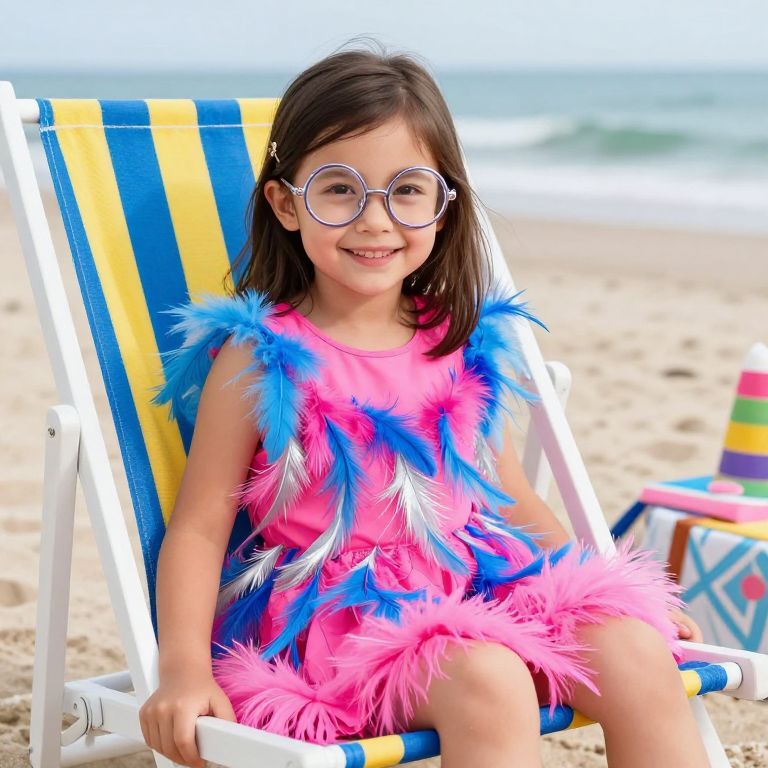 A playful girl with big round glasses and a bright pink dress adorned with cascading, soft blue and silver feathers, sitting on a beach chair at a seaside birthday party with a striped blue and yellow beach towel, smiling at the camera with a happy expression