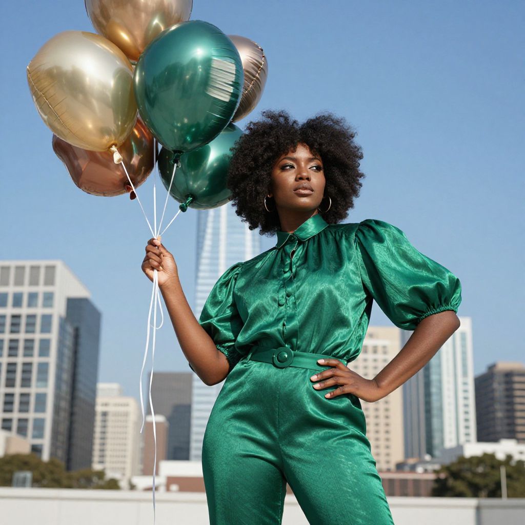 Photograph of a confident Black woman with natural afro, wearing a green satin jumpsuit, holding metallic balloons, against a cityscape background.