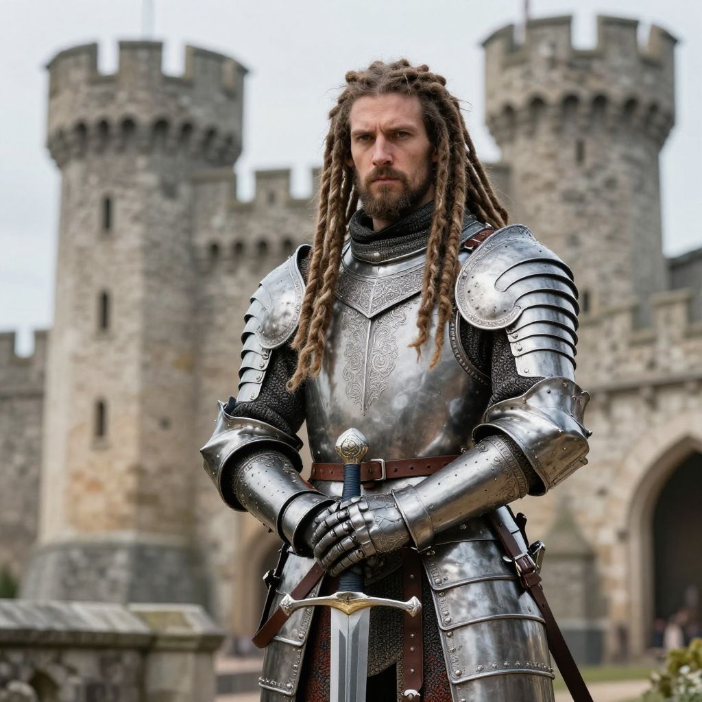 Photorealistic digital artwork of a bearded, dreadlocked knight in shining armor standing before a medieval stone castle with tall towers.