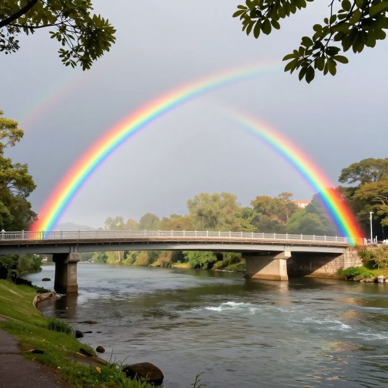 A vibrant rainbow arches gracefully over a serene bridge, symbolizing hope and unity amidst the tranquil embrace of nature, where the gentle hum of flowing water and the soft rustle of leaves evoke a profound sense of peace and renewal.